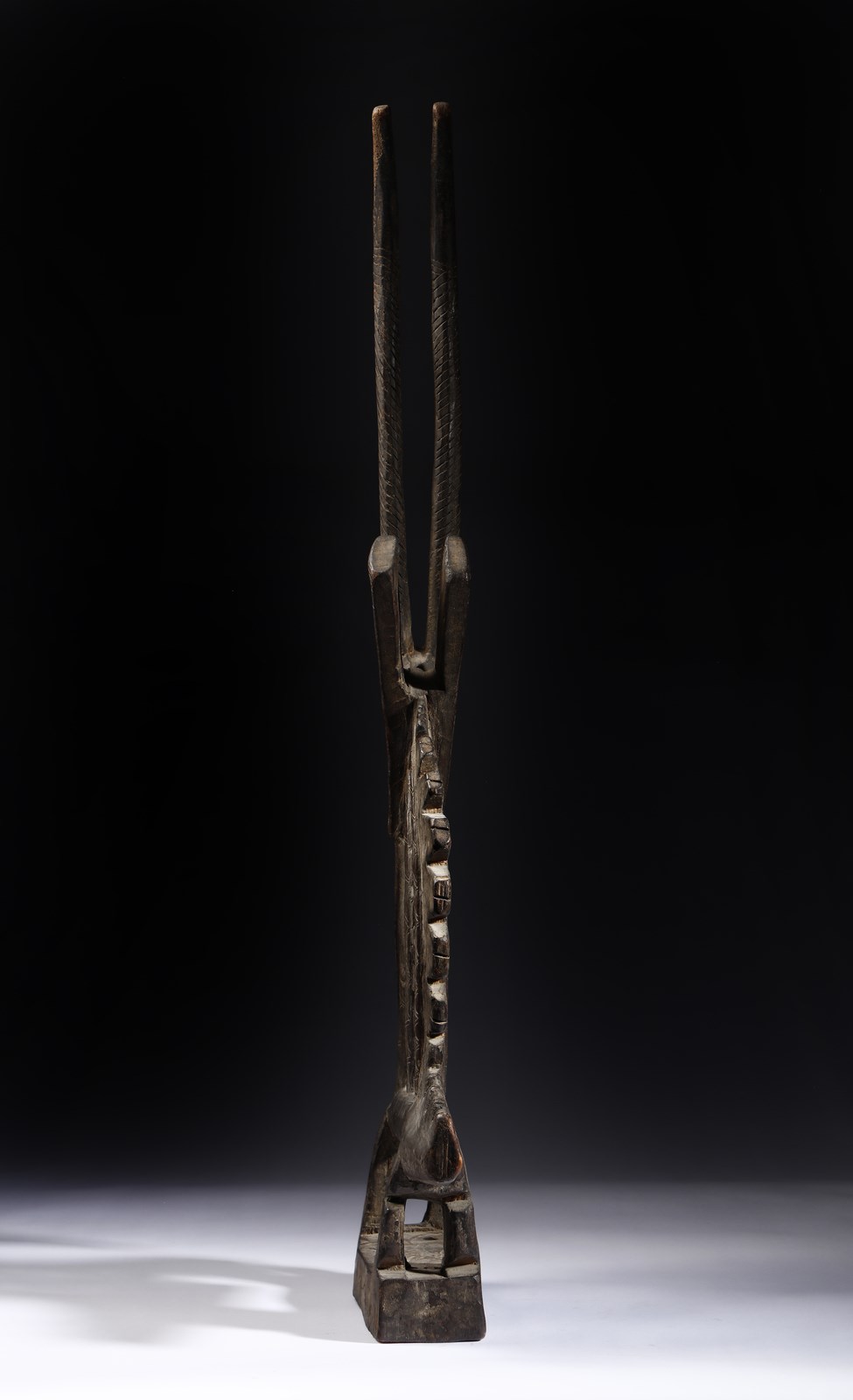 . . Cm 6,50 x 79,50. Cimiero da danza in legno a patina scura raffigurante antilope stilizzata. I fantasiosi cimieri Chiwara, realizzati secondo vari stili e in grande varietà di forme, vengono impiegati all'interno dei rituali connessi alle pratiche agricole delle popolazioni Bamana del Mali. Questo particolare modello costituito da una antilope stilizzata la cui silhouette si sviluppa verticalmente viene definito come stile Segu ed è tipico delle zone settentrionali del Mali.
