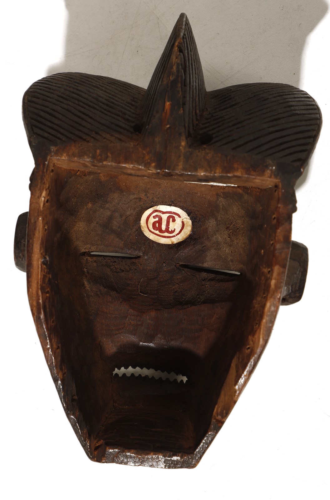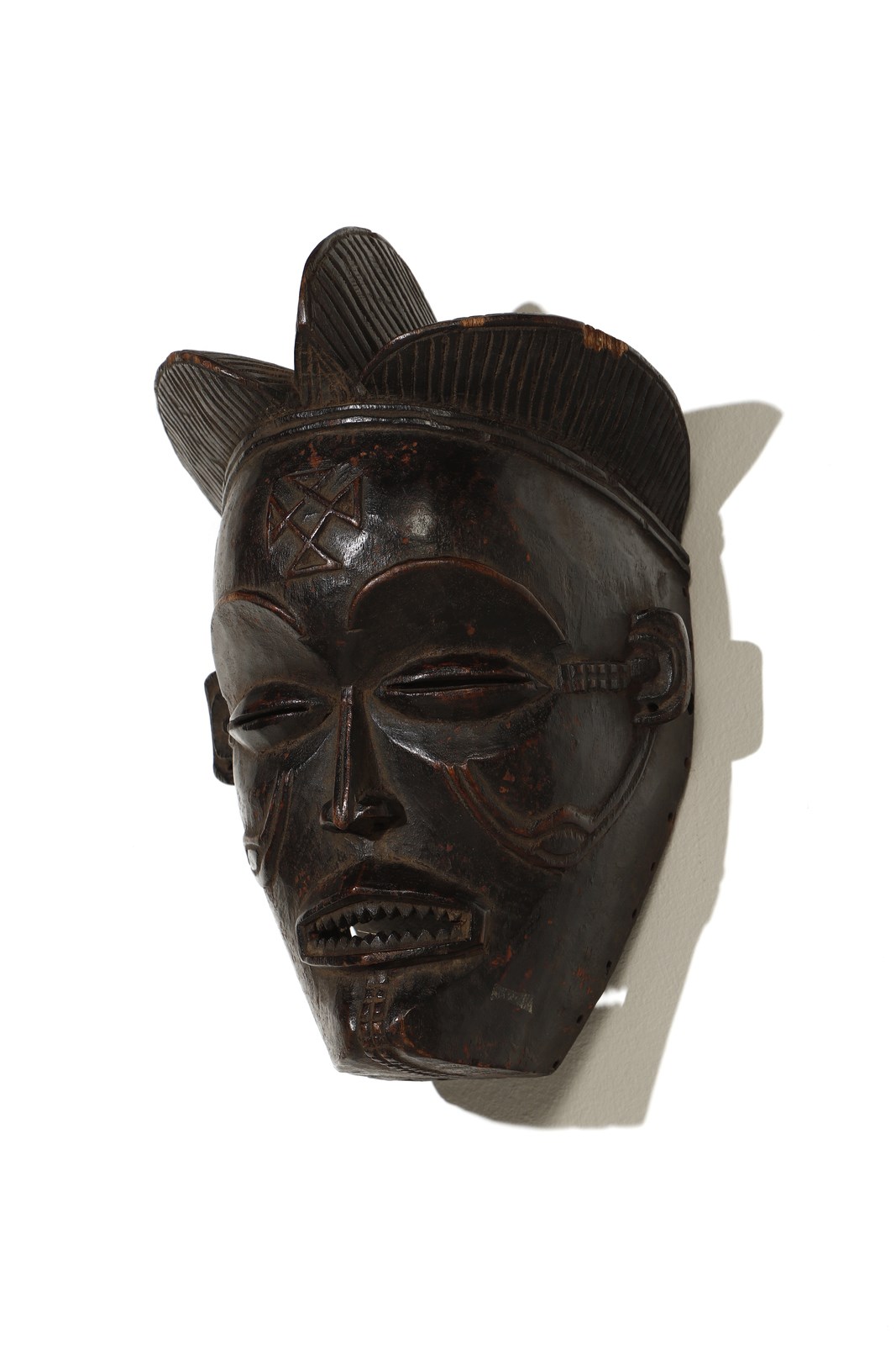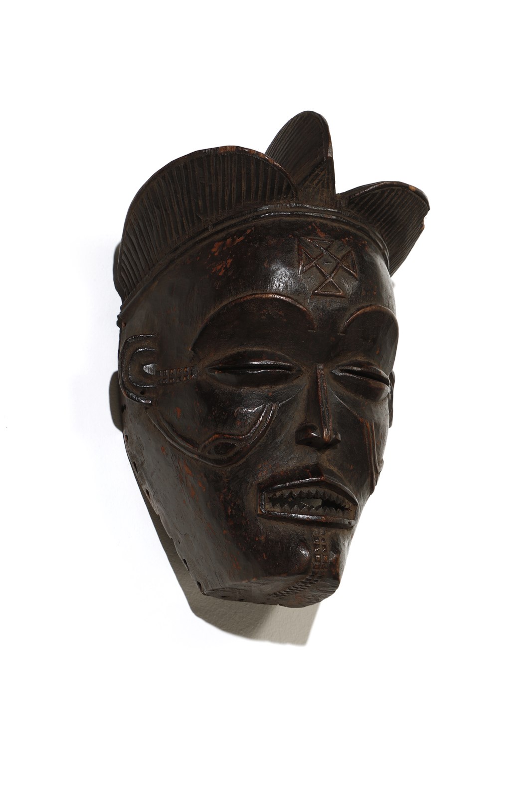 . . Cm 19,50 x 26,00. Elegante maschera a patina bruna raffigurante il volto ieratico di uno spirito femminile ancestrale. Le maschere femminili Pwo, con la loro controparte maschile Cihongo costituiscono uno dei pilastri dei riti iniziatici della società Chokwe