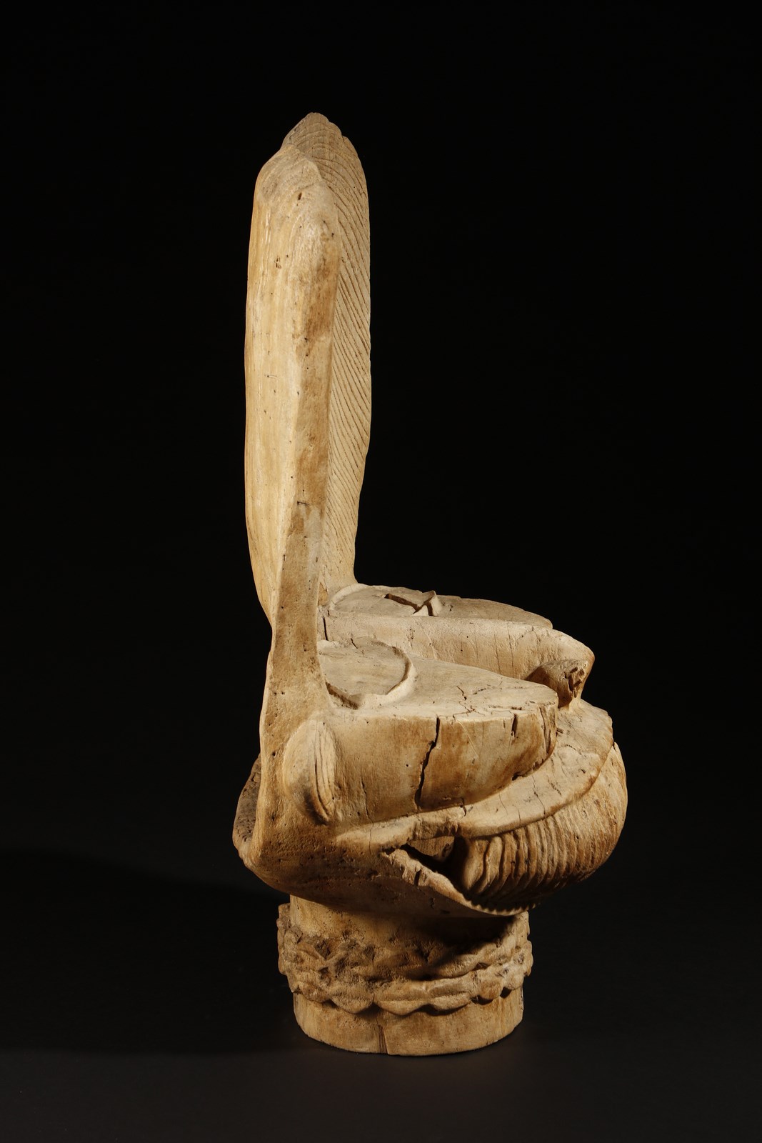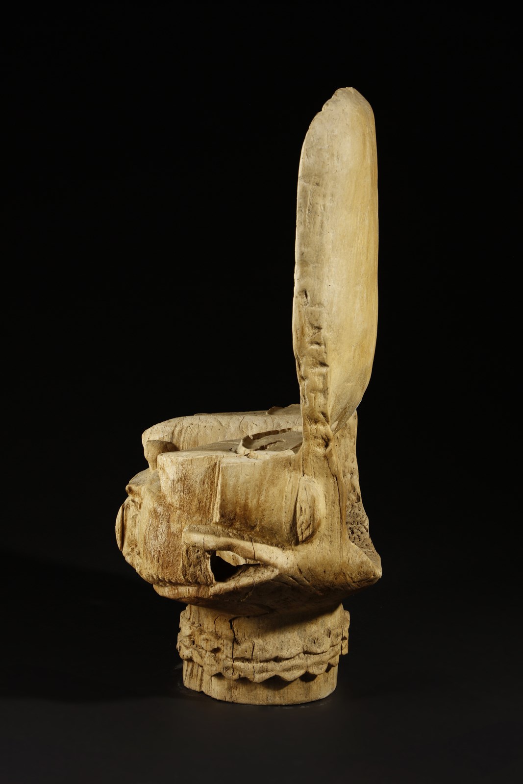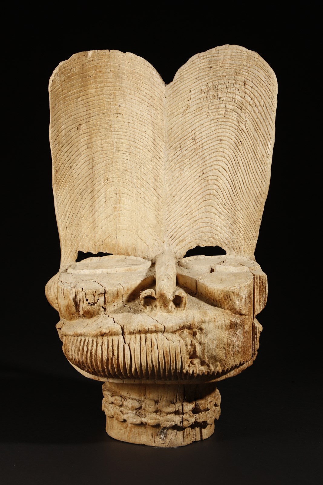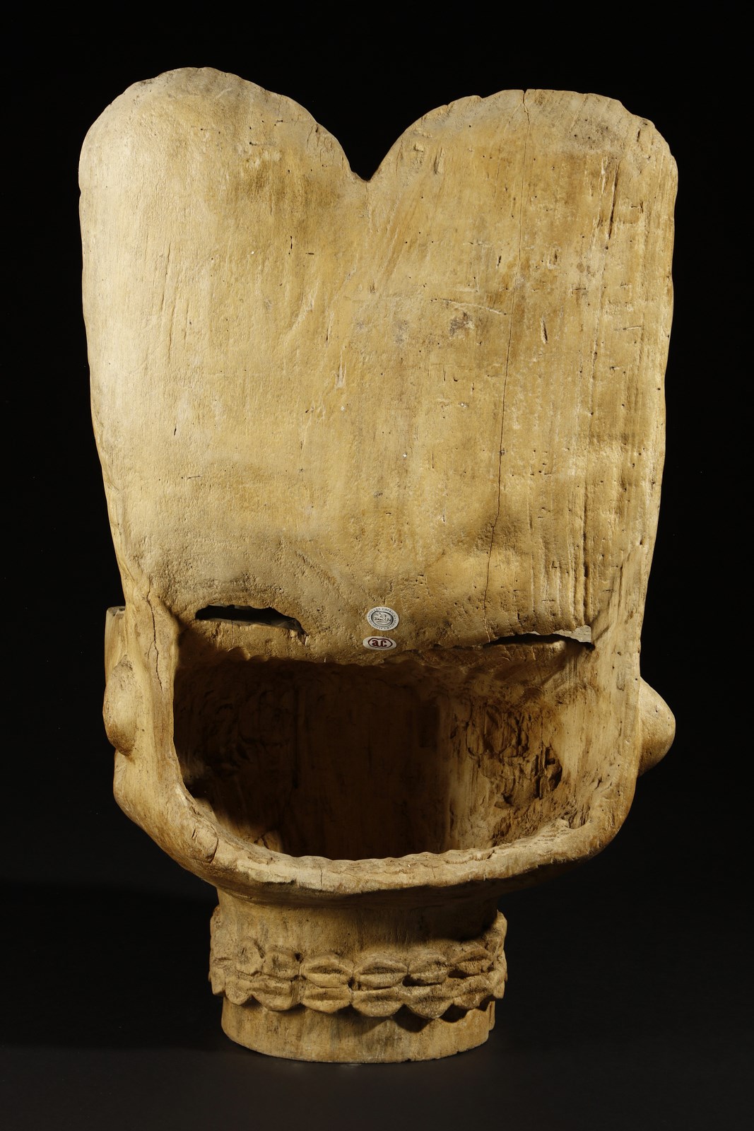 . . Cm 59,00 x 94,50. Interessante e raro cimiero Tsesah in legno chiaro decorato a motivi geometrici incisi. Questo tipo di maschera, identificato talvolta con il nome di Batcham, è riconducibile alla società misterica Nsop e veniva impiegata durante i riti funebri o di intronazione dei sovrani Bamileke stanziati nelle regioni occidentali del Camerun