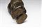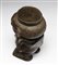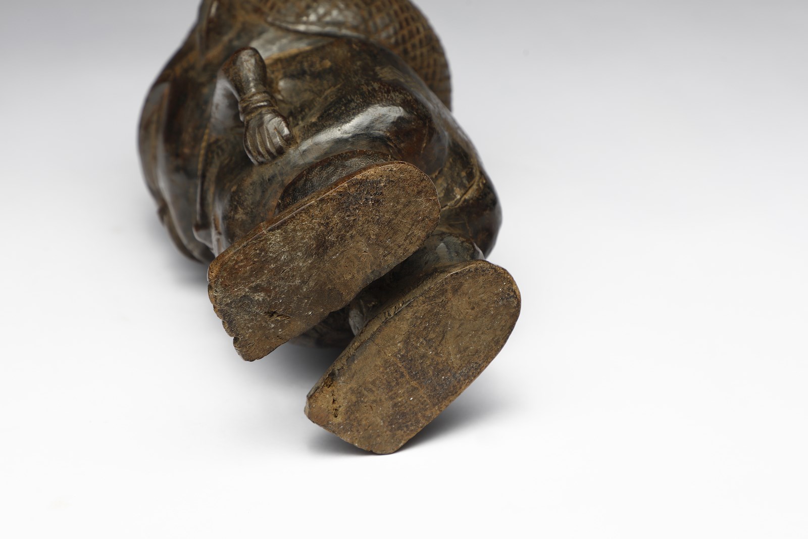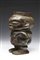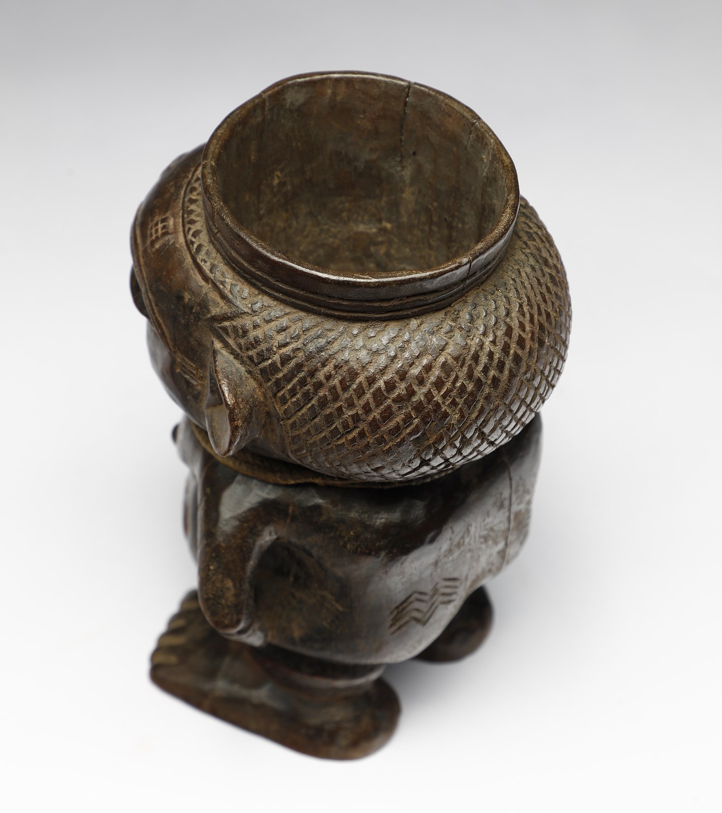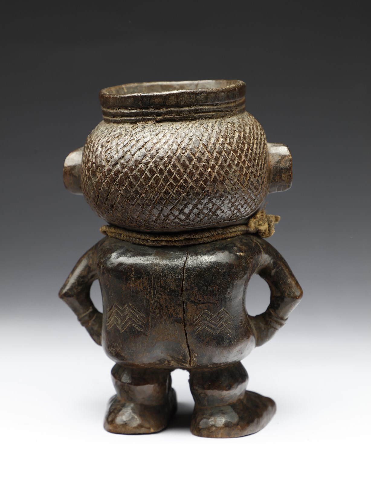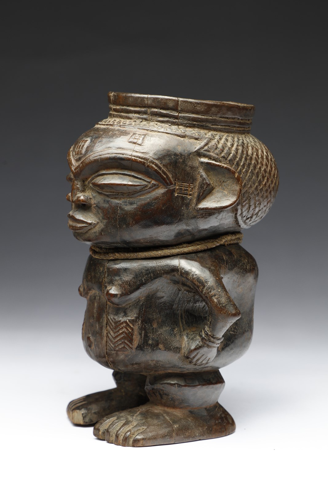 . . Cm 19,50. Interessante coppa rituale realizzata in legno a patina scura raffigurante uomo in piedi con le mani appoggiate sui fianchi, il corpo breve e tondeggiante sorregge la grande testa rotonda cava all'interno. Questo tipo di manufatti, preposti a contenere vino di palma, erano parte integrante di importanti cerimonie religiose.