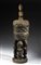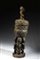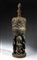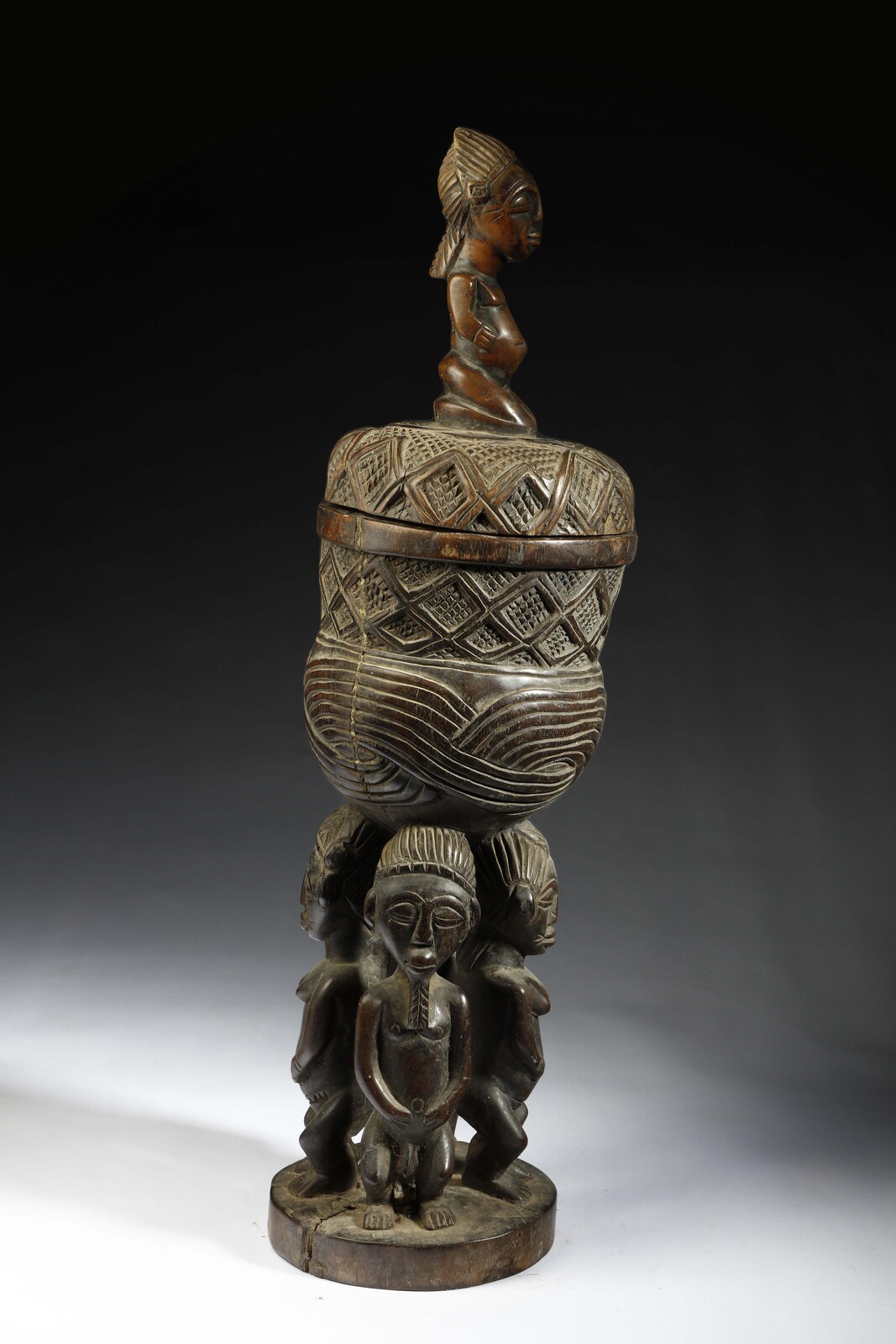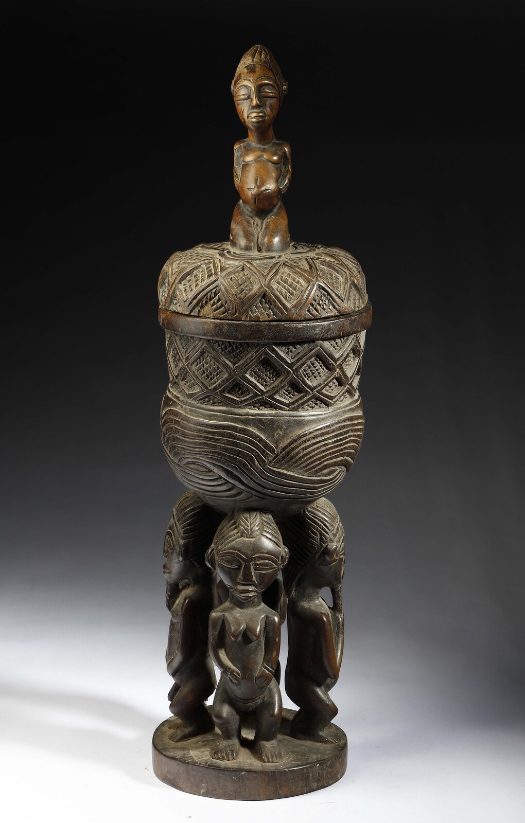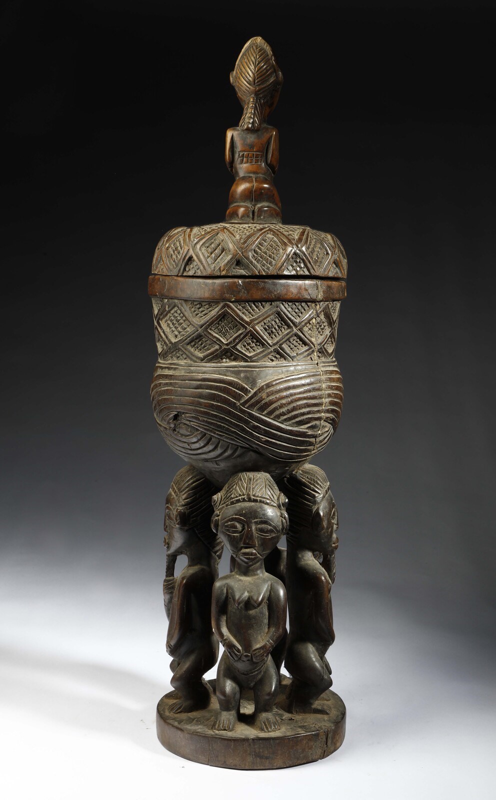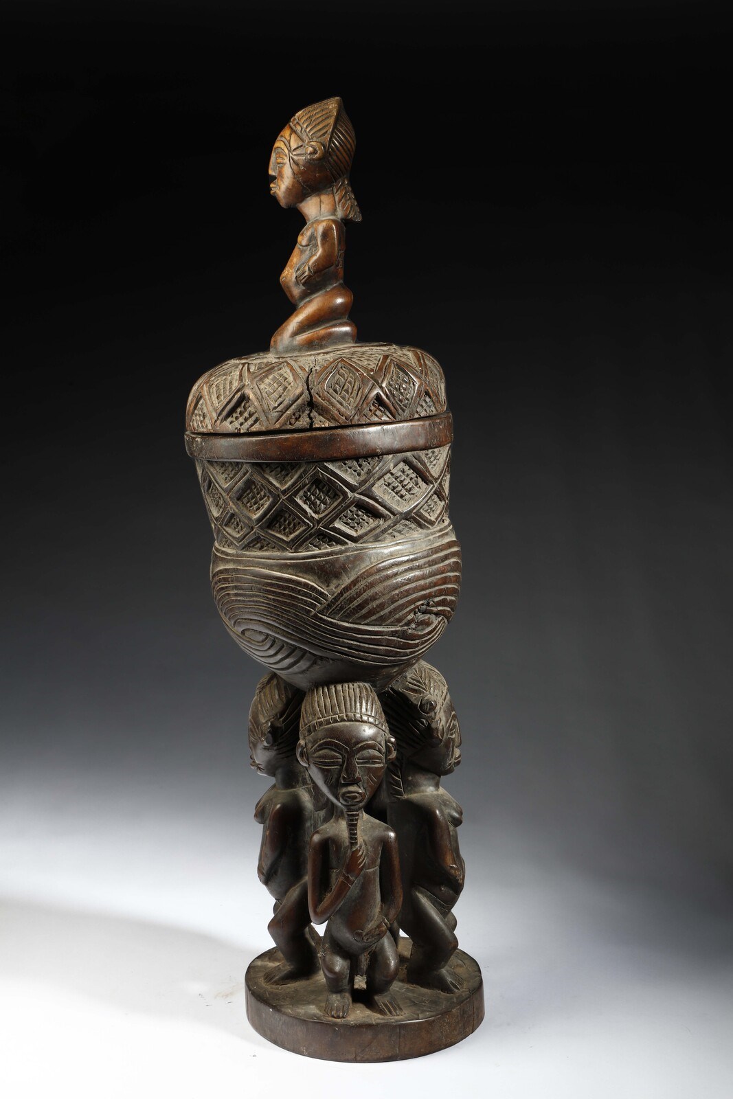 . . Cm 66,00. Importante coppa cerimoniale realizzata in legno a patina bruna scolpito con quattro cariatidi maschili e femminili che sorreggono la coppa decorata con fitto intreccio geometrico. Il coperchio della coppa è sormontato da una figura in piedi.