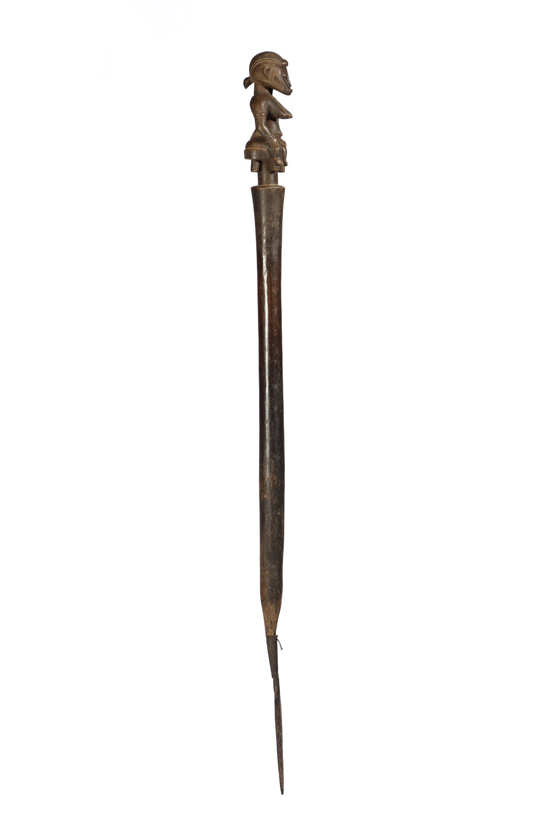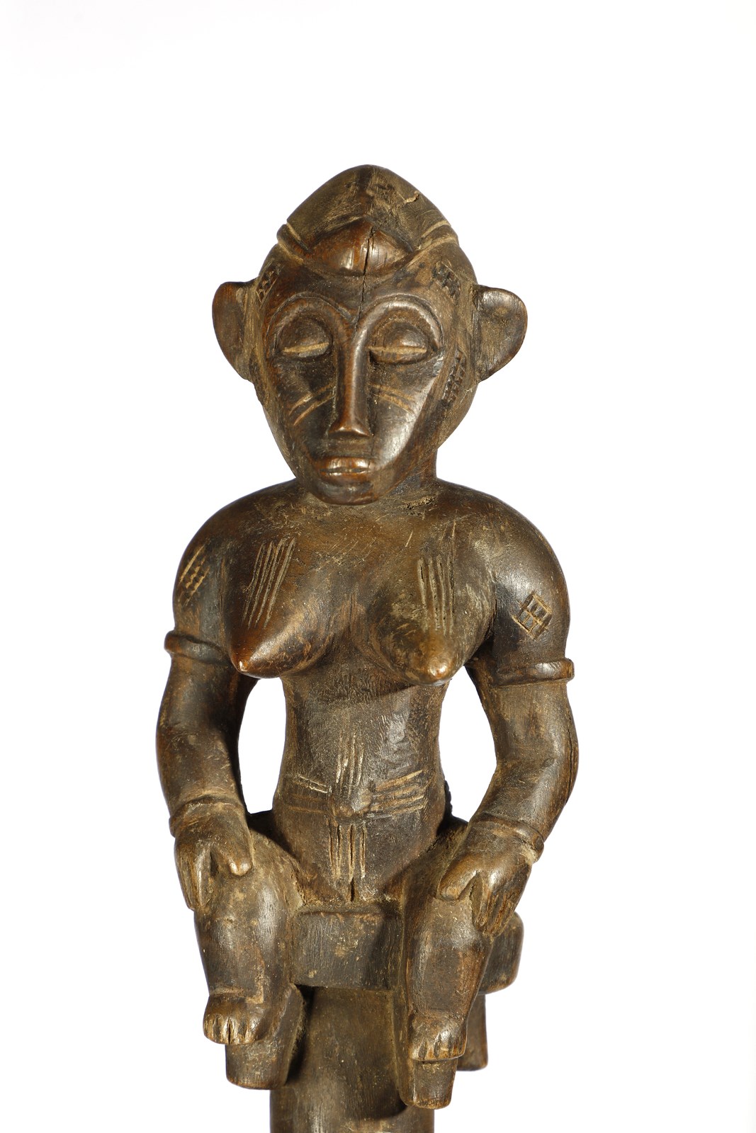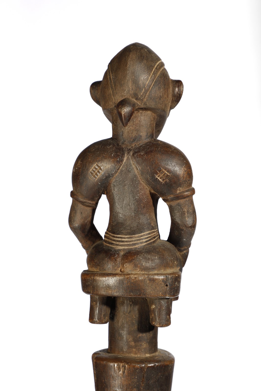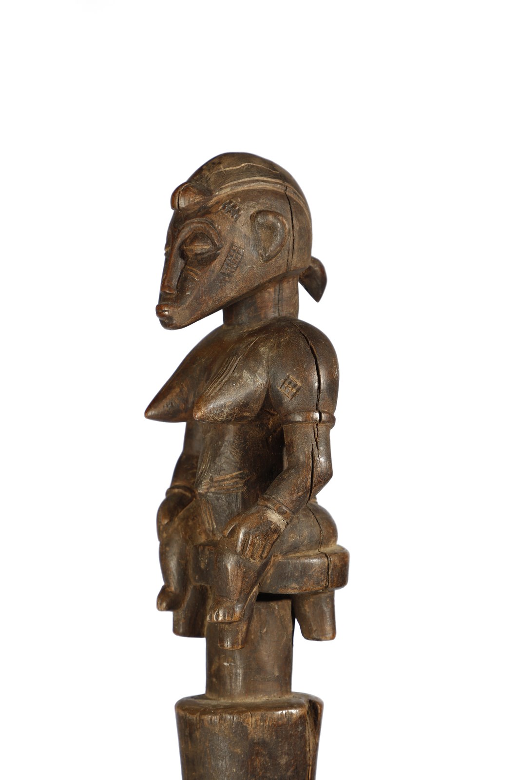 Senufo, Costa d'Avorio. . Cm 133,00. Bastone cerimoniale in legno a patina bruna terminante con figura femminile assisa su sgabello. Questo tipo di bastoni in molti casi costituivano un premio dato ai coltivatori dal capo villaggio.