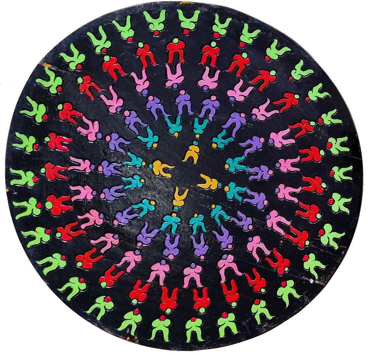 EMMETT WILLIAMS Stati Uniti 1925-Berlino 2007 “The glorious day when all the little people in the whole wide word decided to be different” colore, acrilici e flatting su legno inciso a mano cm 80 di diametro e cm 2,2 di spessore del 1990-1996. Sul retro etichetta descrittiva con firma dell’autore.