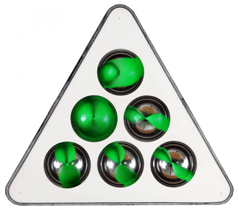 FRANCO COSTALONGA 1933 " OC6 - 15 VETB 72 ", 1972 Assemblaggio, legno e plastica con 6 semisfere, cm. 70 x 70 x 10 Firmato e datato sul retro Prov. Collezione Privata