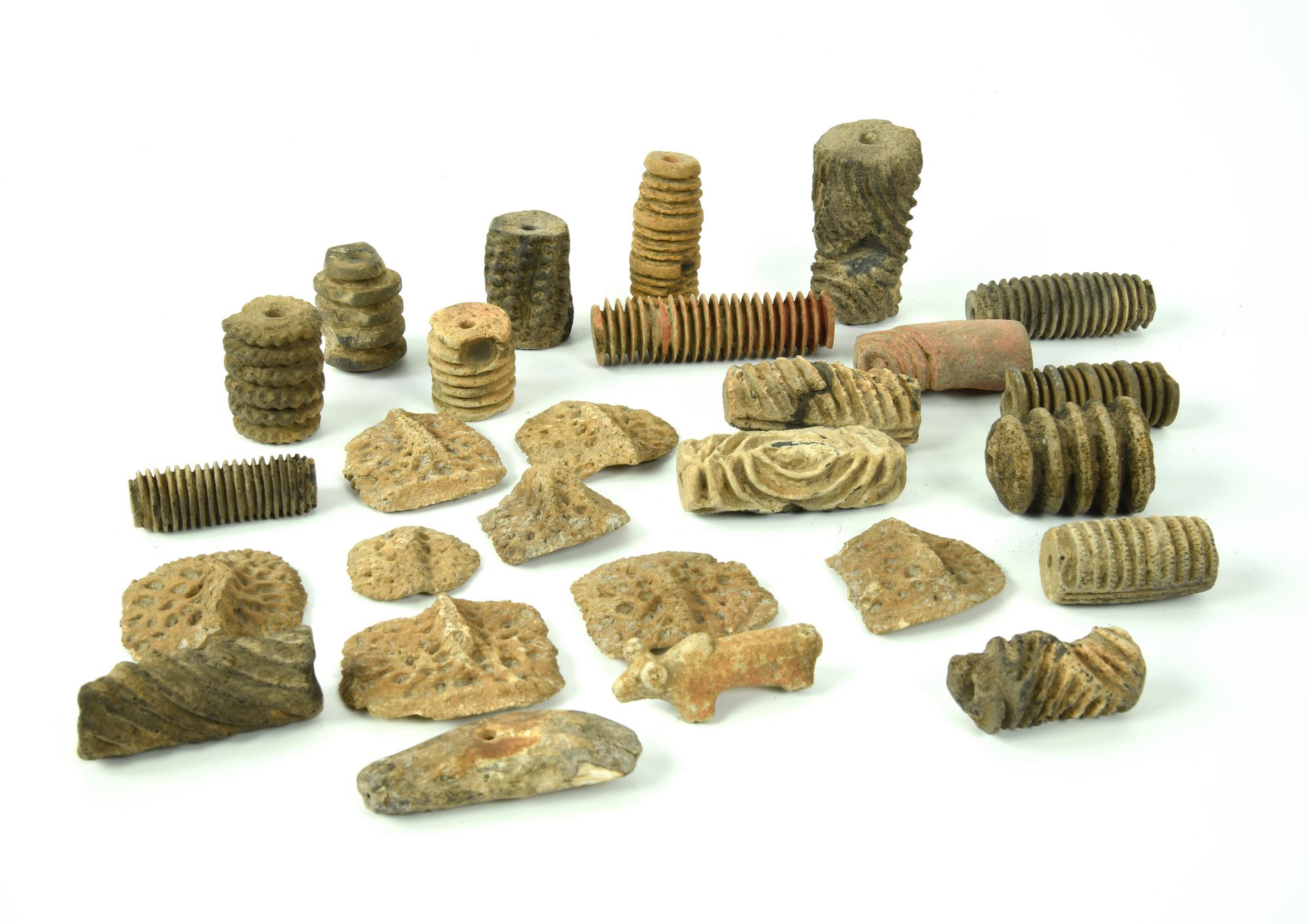 Lotto di otto strumenti in terracotta per decorazione, diciassette cilindri incisi a motivi geometrici in terracotta,una statuetta di zeb� e un pendente in avorio