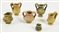 Cinque krateriskoi con orlo estroflesso a tesa, corpo bitroncoconico, anse a nastro impostate verticalmente dall'orlo alla risega, piede troncoconico, un vasetto miniaturistico con orlo estroflesso e corpo ovoide