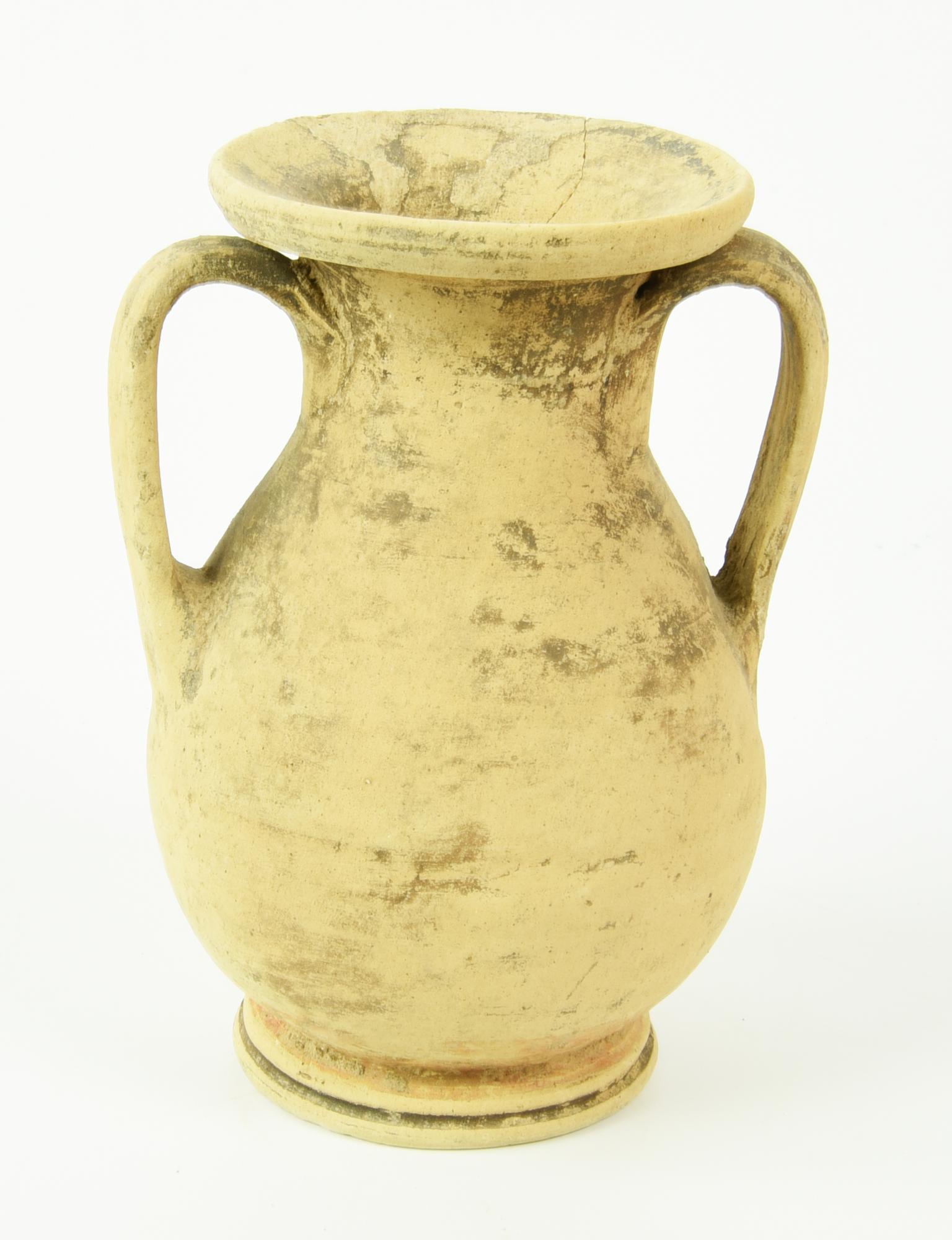 Labbro estroflesso con orlo modanato, collo a profilo concavo, indistinto dal corpo ovoide, anse a nastro impostate verticalmente dal collo alla spalla, piede ad echino modanato