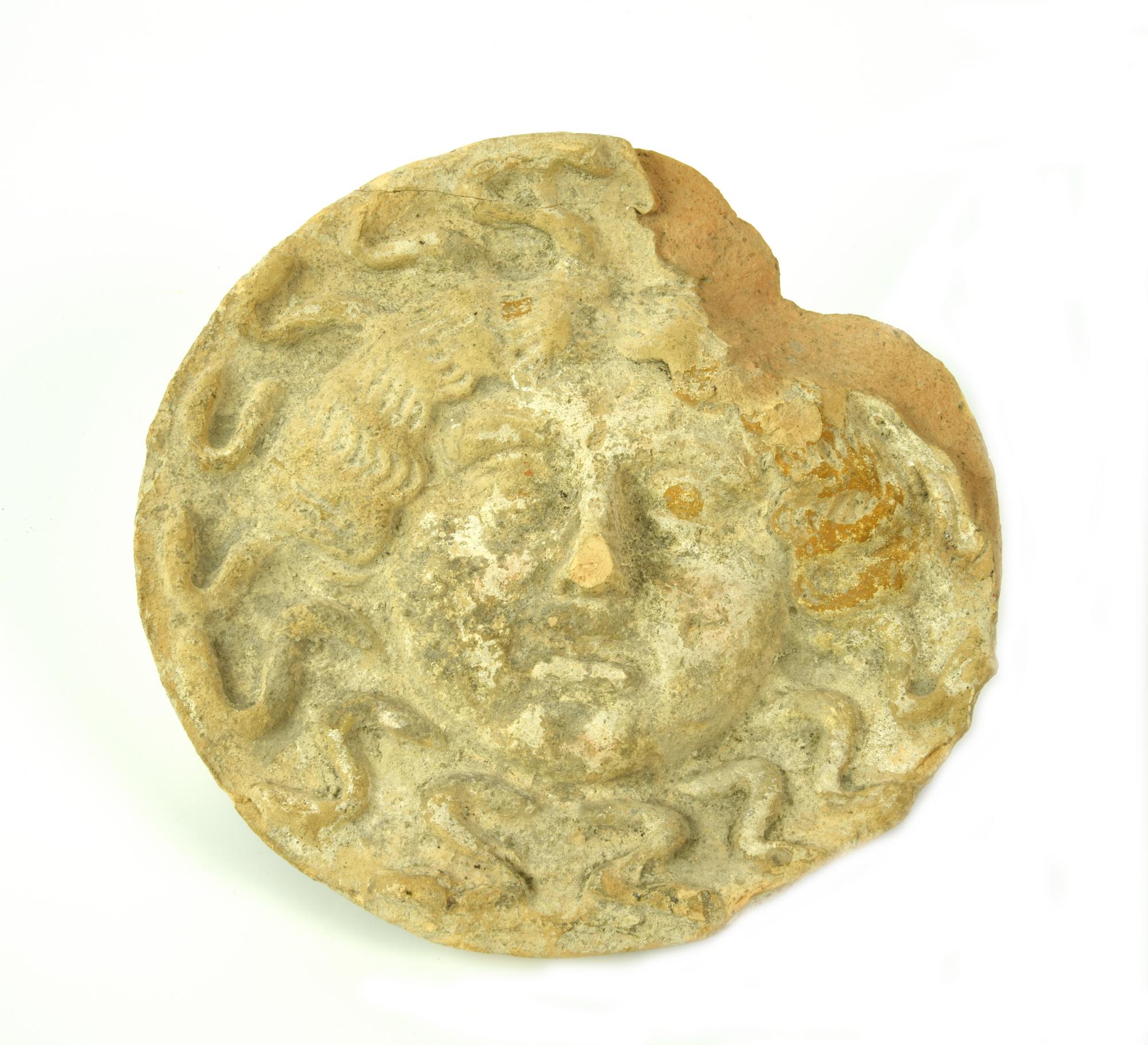 Antefissa circolare con testa di Gorgone di tipo calmo, una corona di serpentelli sinuosi circonda il volto, capelli ondulati, grandi occhi sgranati, zigomi rilevati, bocca chiusa, piccolo mento infossato. Si conservano tracce del colore originale rosa per l'incarnato e bruno per i capelli