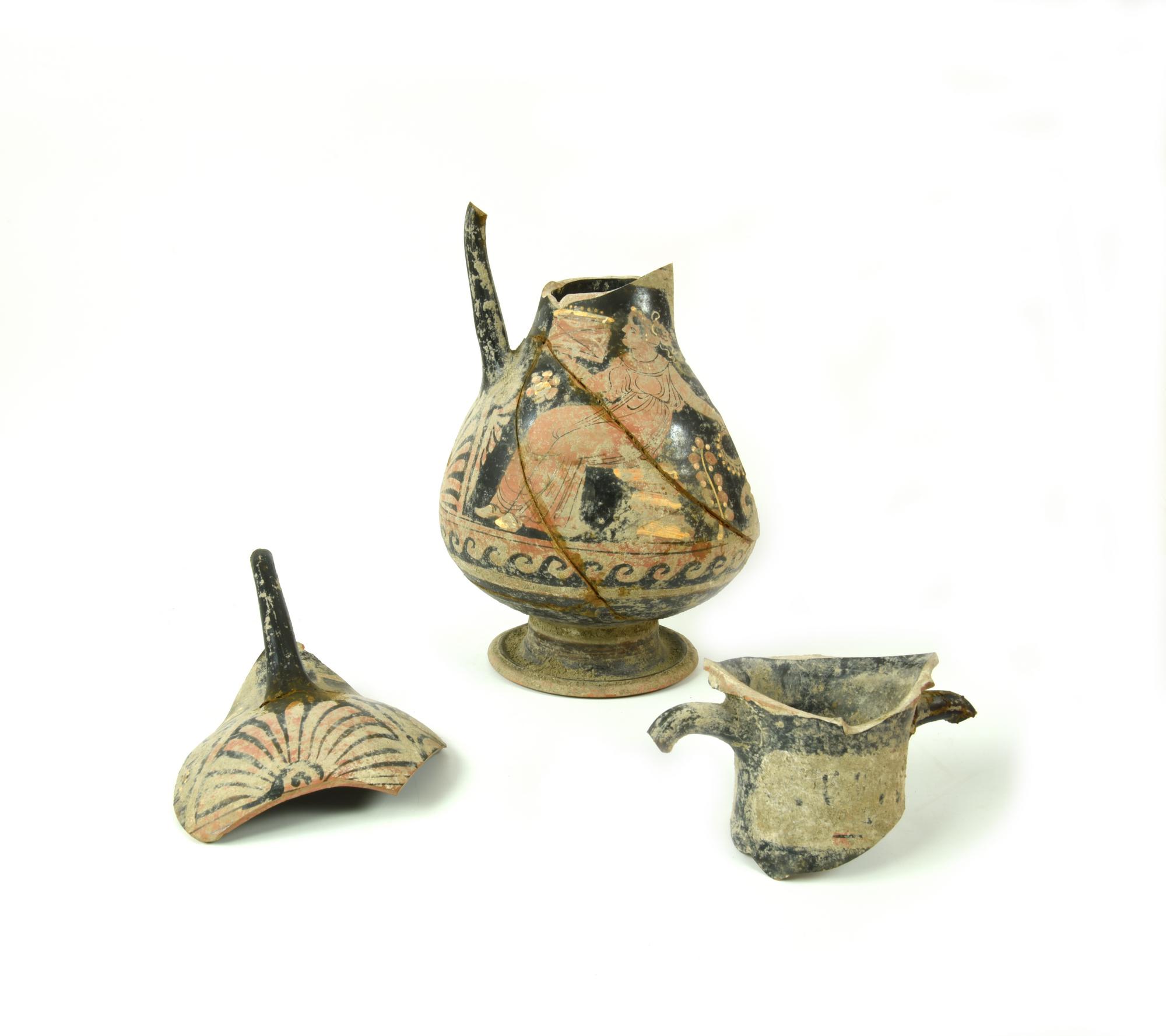MATERIA E TECNICA: argilla figulina camoscio, vernice nera lucente, suddipinture in bianco e giallo, coloritura arancio, modellata a tornio veloce