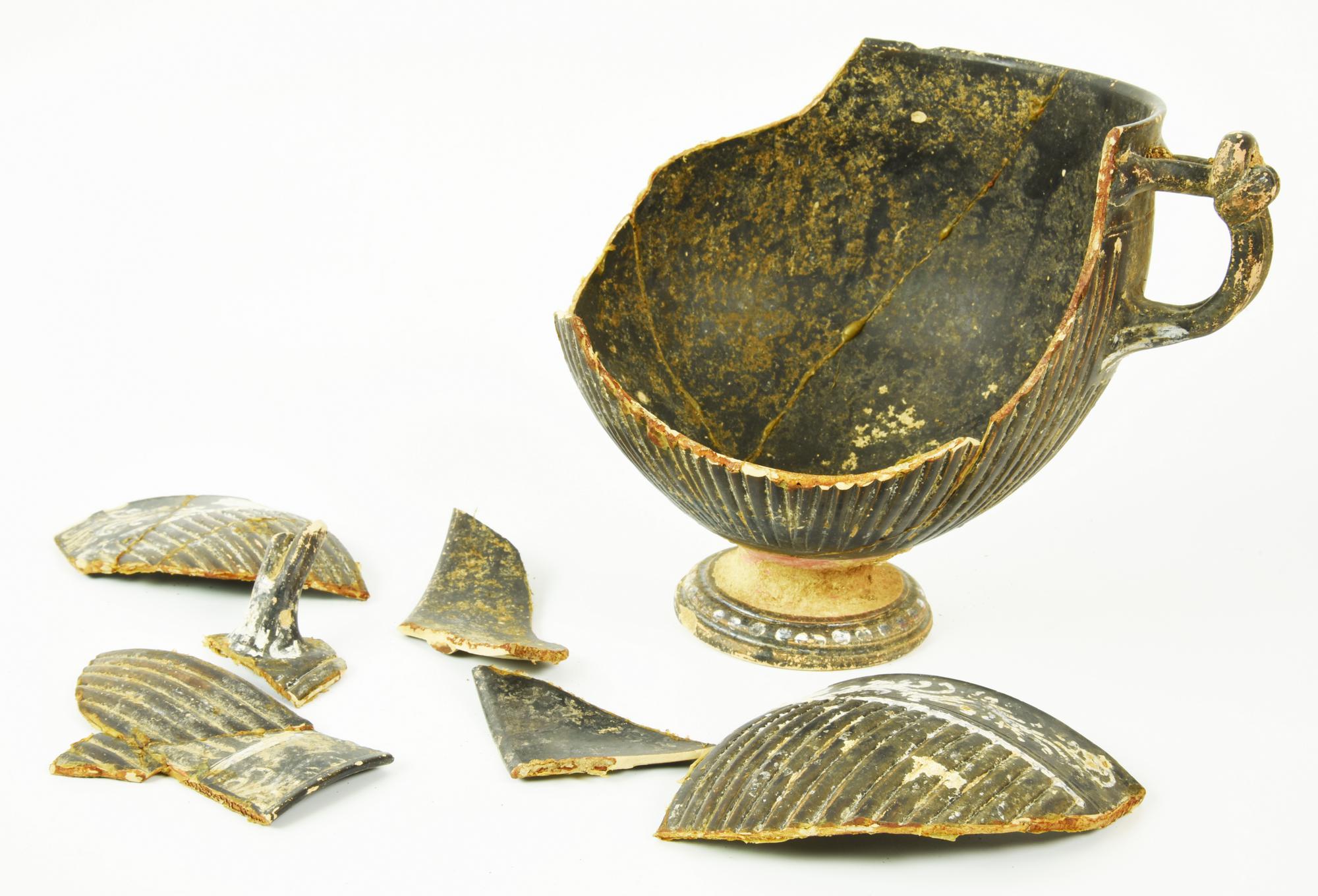Skyphos con orlo rettilineo, corpo troncoconico allungato verso il basso e decorato a baccellature, piede ad echino, anse a doppio bastoncello impostate orizzontalmente sotto il bordo e annodate, decorato sull'orlo con tralci fitomorfi centrati da profilo umano volto a destra