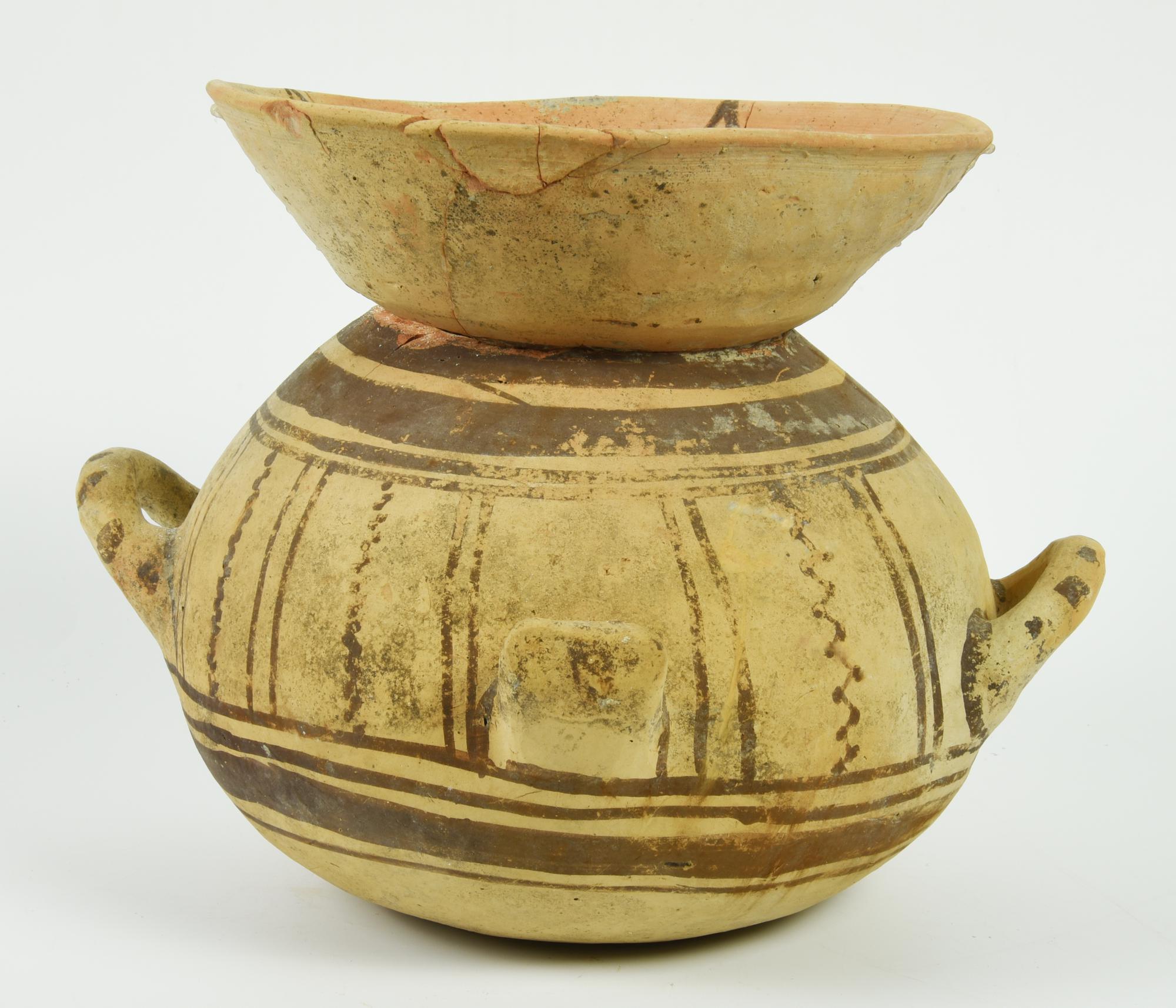 Orlo ad imbuto; corpo globulare schiacciato ai poli; fondo piatto; anse a bastoncello schiacciato semianulari, impostate obliquamente sulla spalla, alternate a due appendici plastiche rettangolari; decorata ad archi di cerchio sull'orlo e motivi geometrici alternati a fasce orizzontali sulla spalla e sul ventre