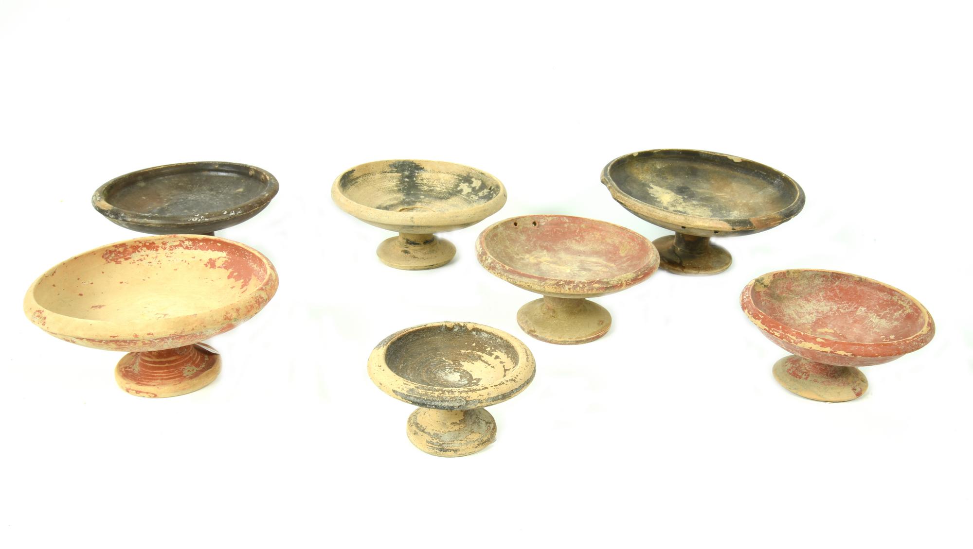 Sette piattelli su piede con orlo rientrante, vasca semicilindrica poco profonda, piede a tromba su breve stelo