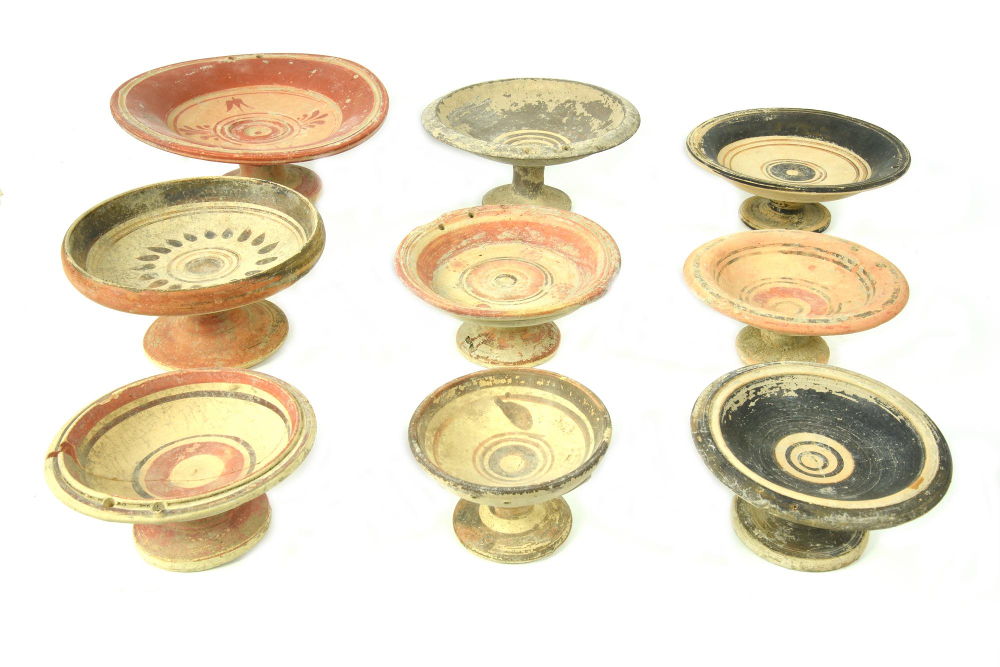 Nove grandi piattelli con orlo svasato, vasca semicilindrica poco profonda, piede a tromba, decorati a fasce e motivi fitomorfi