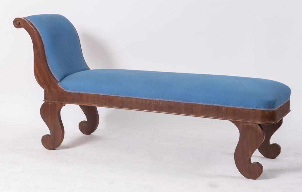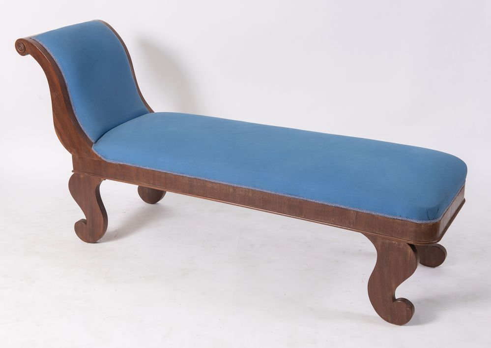 Meridiana in legno di mogano imbottita in stoffa azzurra. Impero austro-ungarico, metà del XIX secolo. Cm 87,5x172x49.