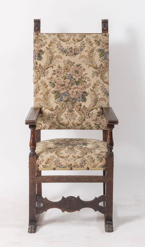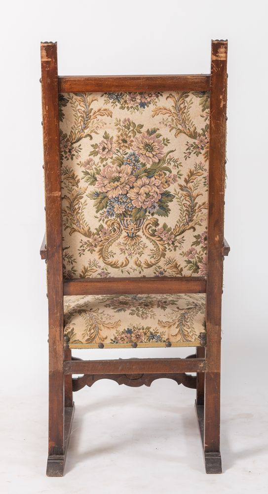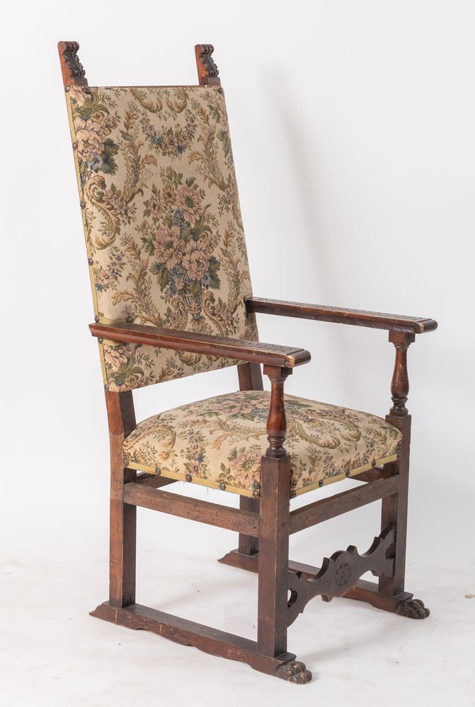 Seggiolone con braccioli di gusto rinascimentale. Italia settentrionale, fine del XIX secolo. Cm 142,5x62x67.