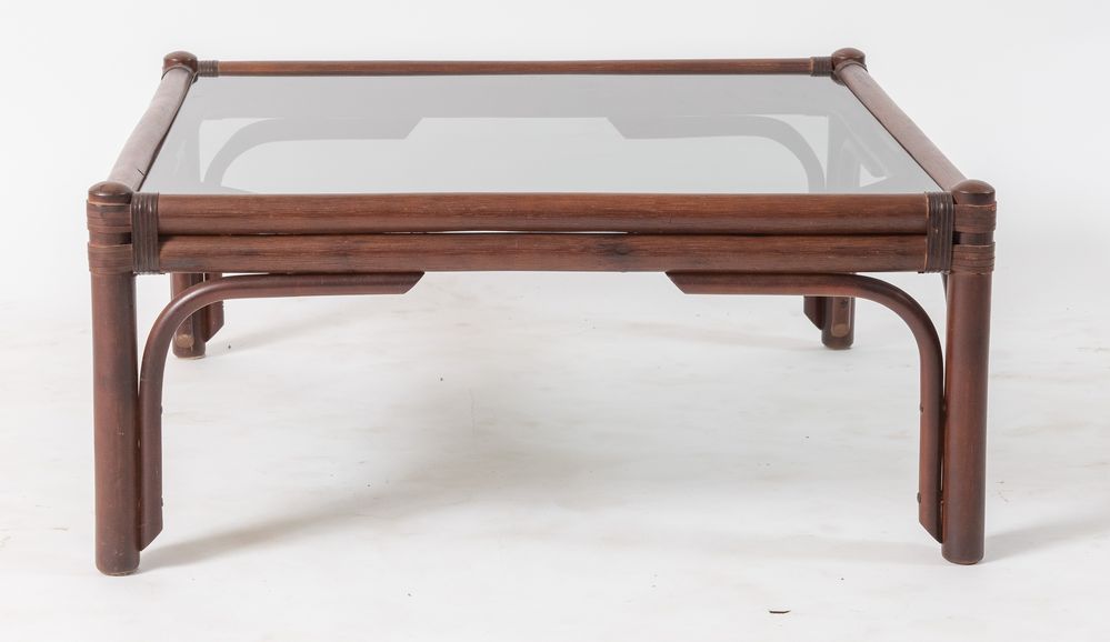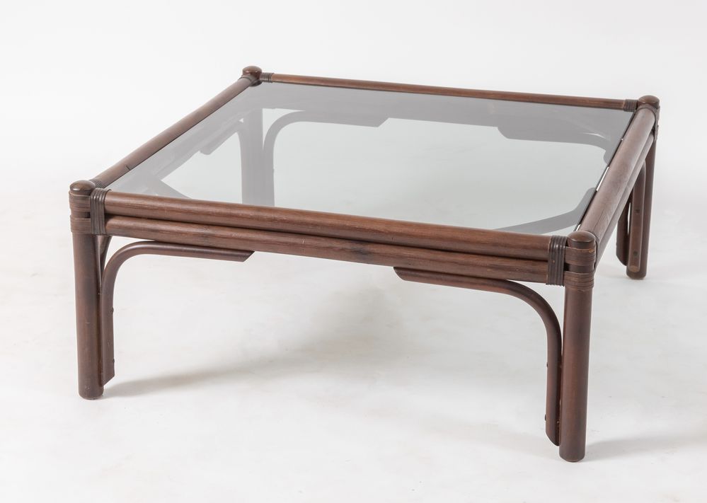 Tavolino di bamboo con piano di cristallo. Inizi del XX secolo. Cm 34x79x79.