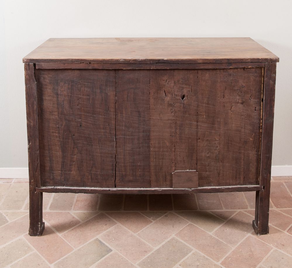 Cassettone con tre cassetti, lastronato in noce e radica di noce. Romagna, inizi del XIX secolo. Cm 97x129x55.