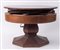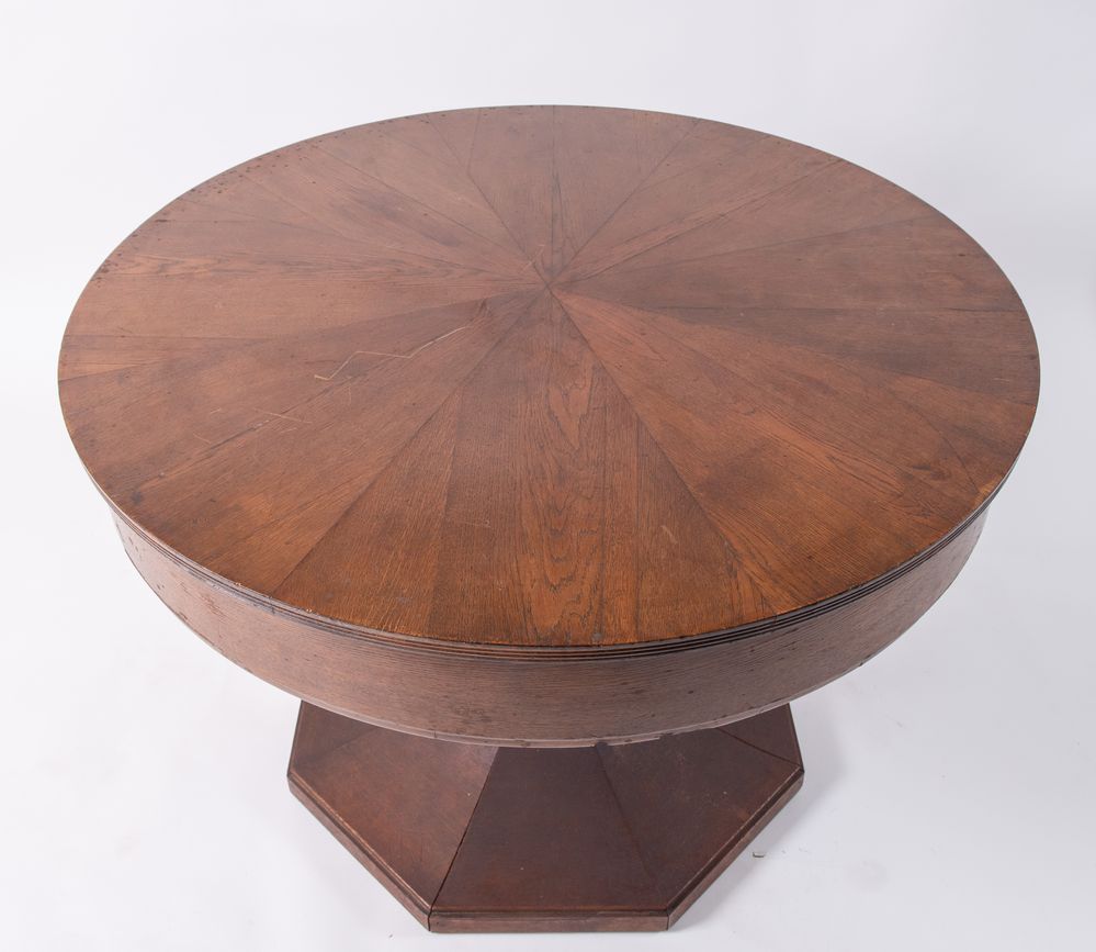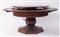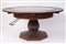 Tavolo navale lastronato in rovere con curioso meccanismo per allargare il diametro. Manifattura inglese, fine del XIX secolo. Cm 76x156 (aperto). Cm 110 (chiuso).