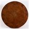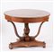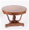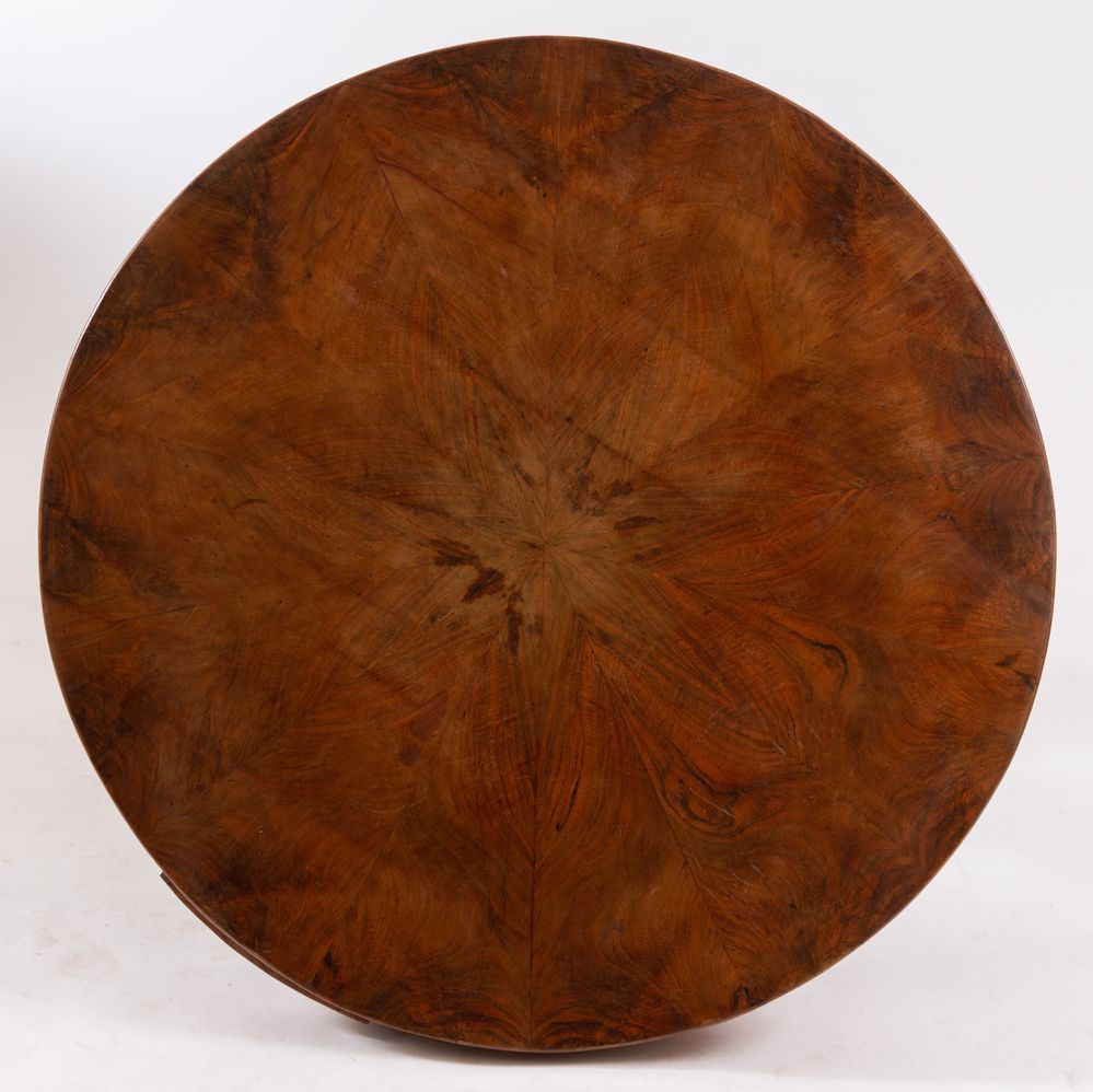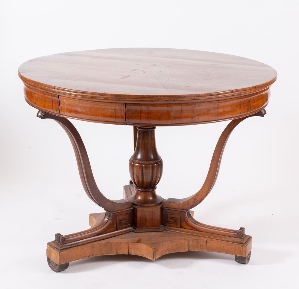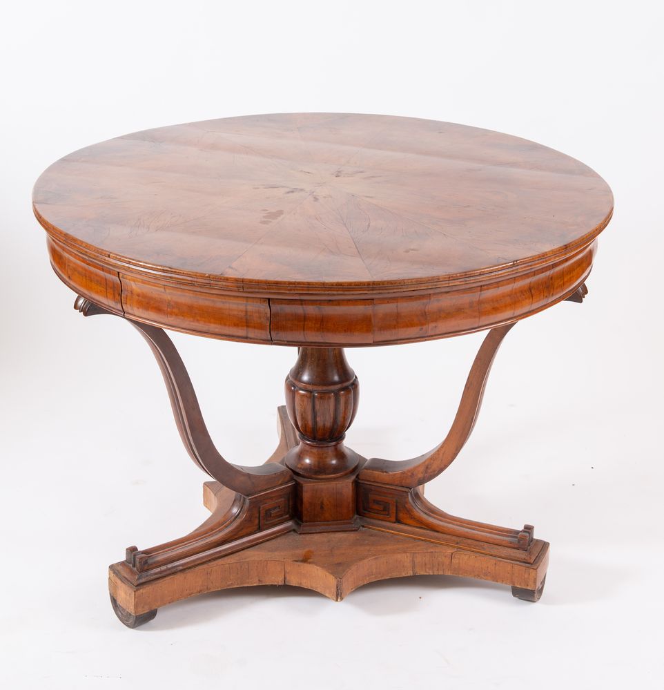 Tavolo da pranzo rotondo, lastronato in piuma noce. Sostegno a balaustra raccordato da tre sostegni ad S alla base. Emilia, metà del XIX secolo. Cm 78,5xØ60.