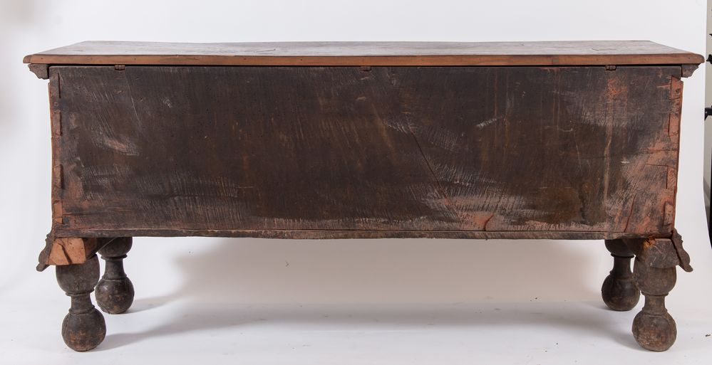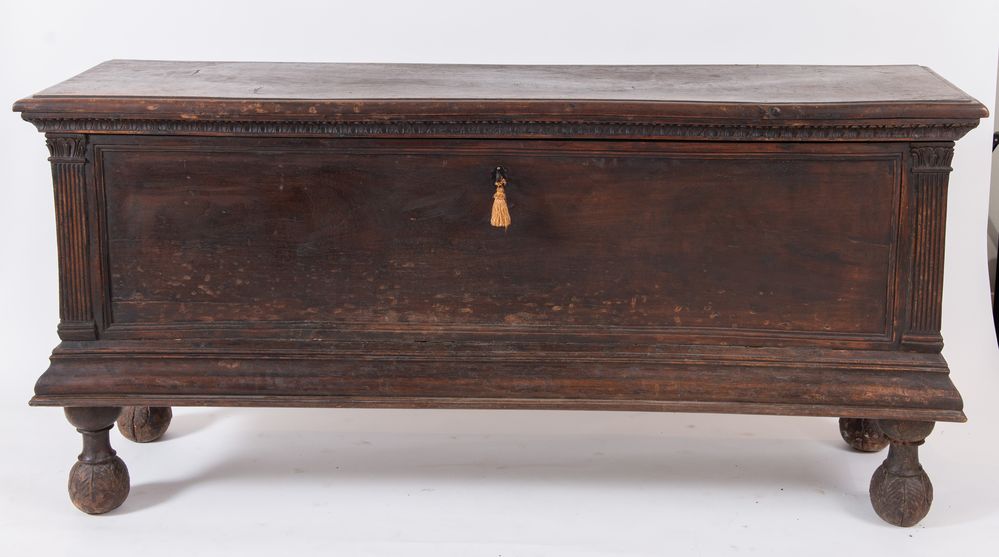 Grande cassapanca in legno di noce. Reca lesene a guisa di colonne agli angoli. Cornicioni fortemente aggettanti alla base e sostegni a palle fogliate alla base. Manifattura alpina, XVII secolo. Cm 91,5x197,5x54,5.