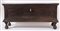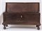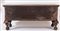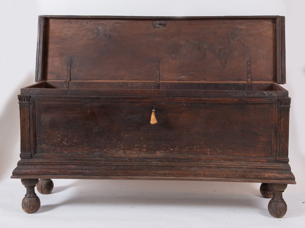 Grande cassapanca in legno di noce. Reca lesene a guisa di colonne agli angoli. Cornicioni fortement