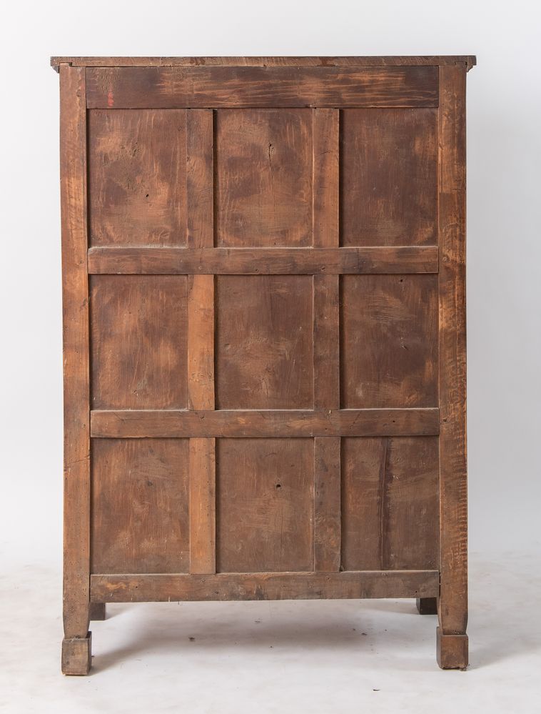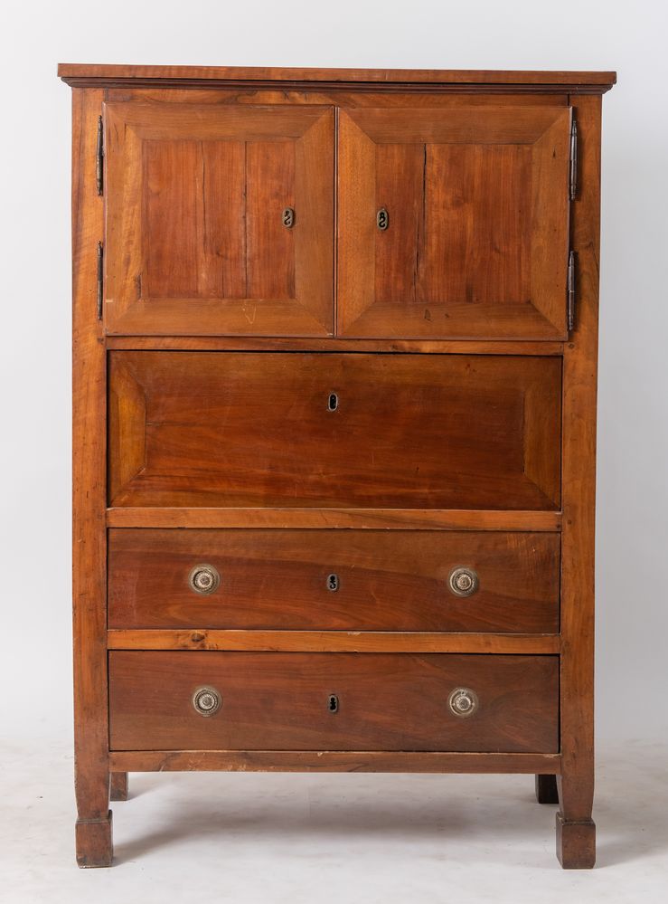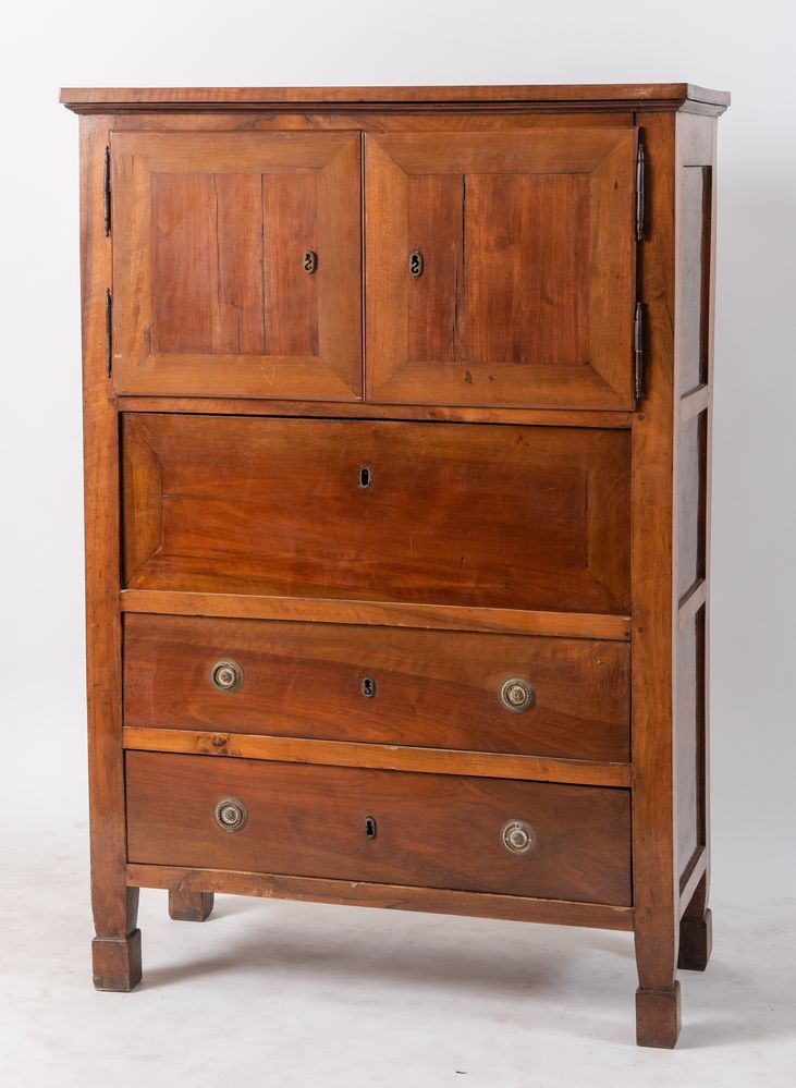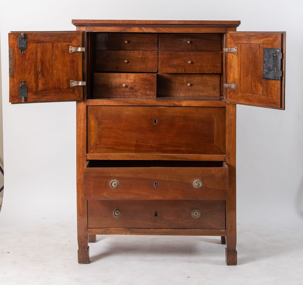 Stipo a cassetti e ante, realizzato in massello di noce. Emilia, inizi del XIX secolo. Cm 168x115,5x51,5.