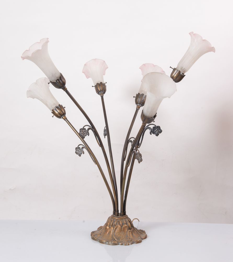 Lampada da tavolo in ottone e vetro lavorati a motivi fitomorfi. Manifattura...