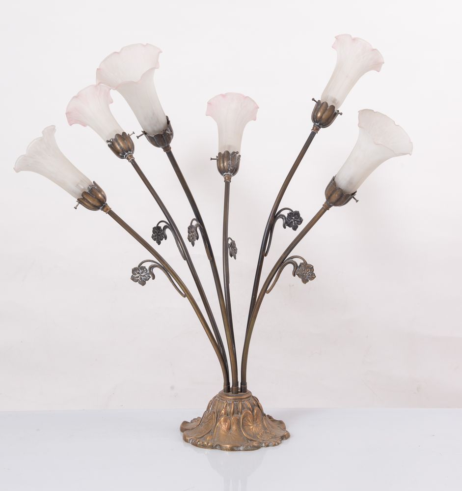 Lampada da tavolo in ottone e vetro lavorati a motivi fitomorfi. Manifattura italiana liberty, inizio XX secolo. Cm 62x47.