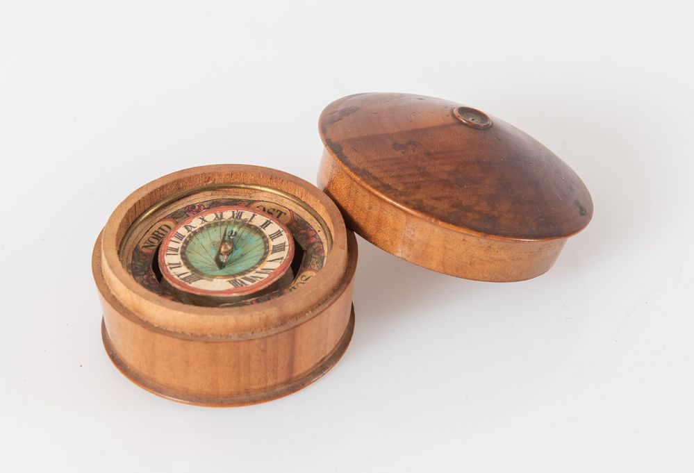 Bussola con contenitore in legno tornito. XVIII secolo. Cm 4,5x6.