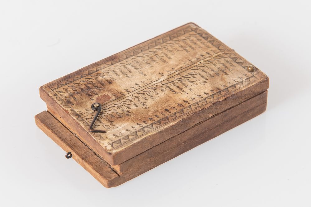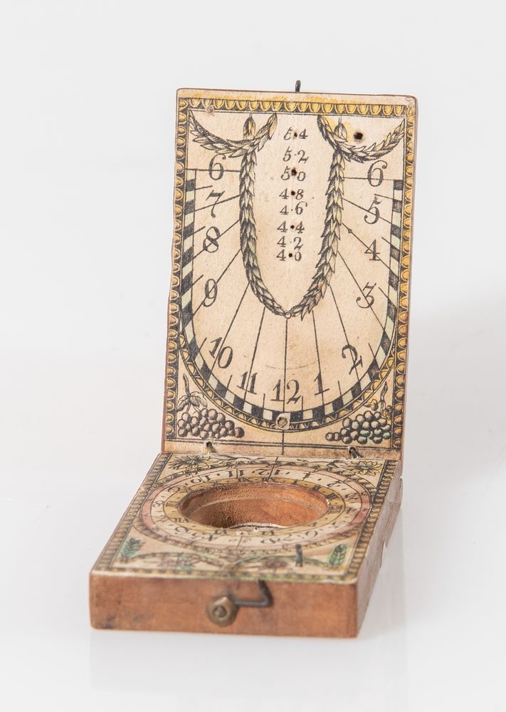 Orologio solare in legno con applicazioni in carta. XVIII secolo. Cm 1,5x4,3x7. (difetti e rotture)