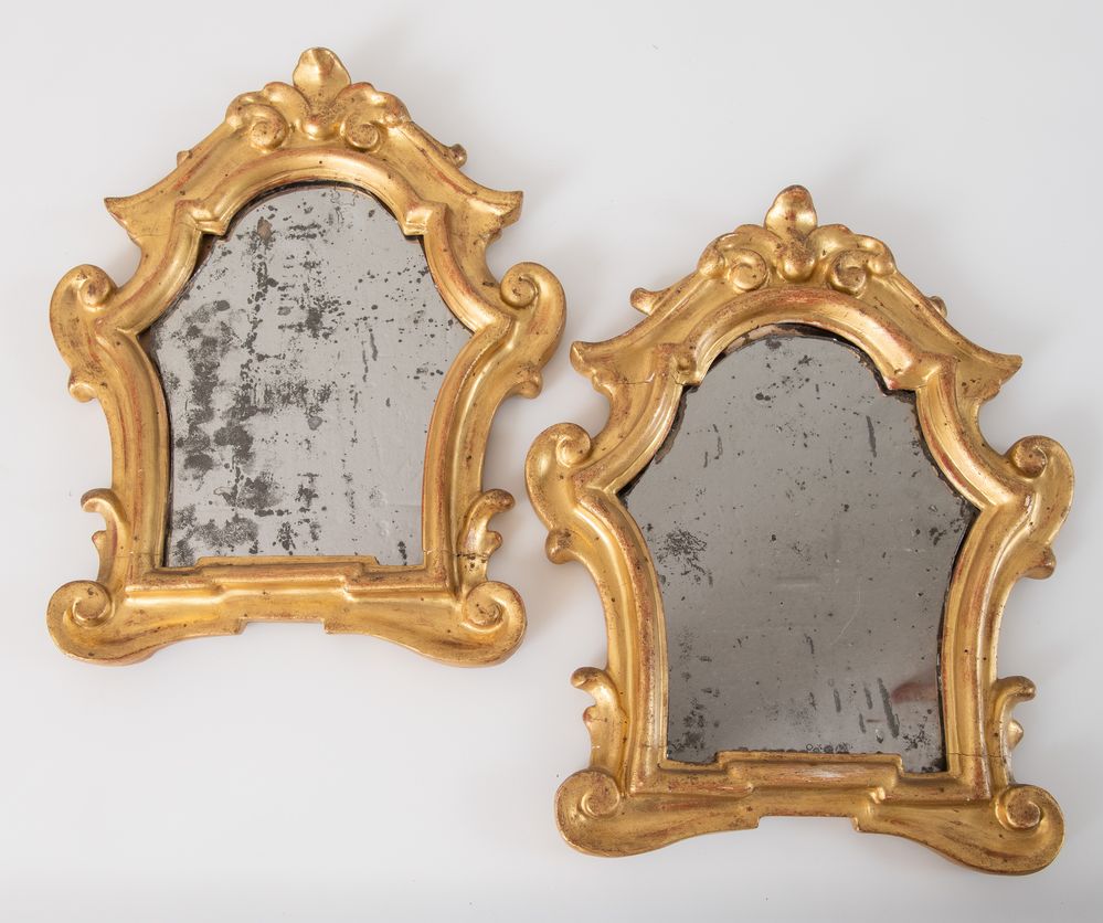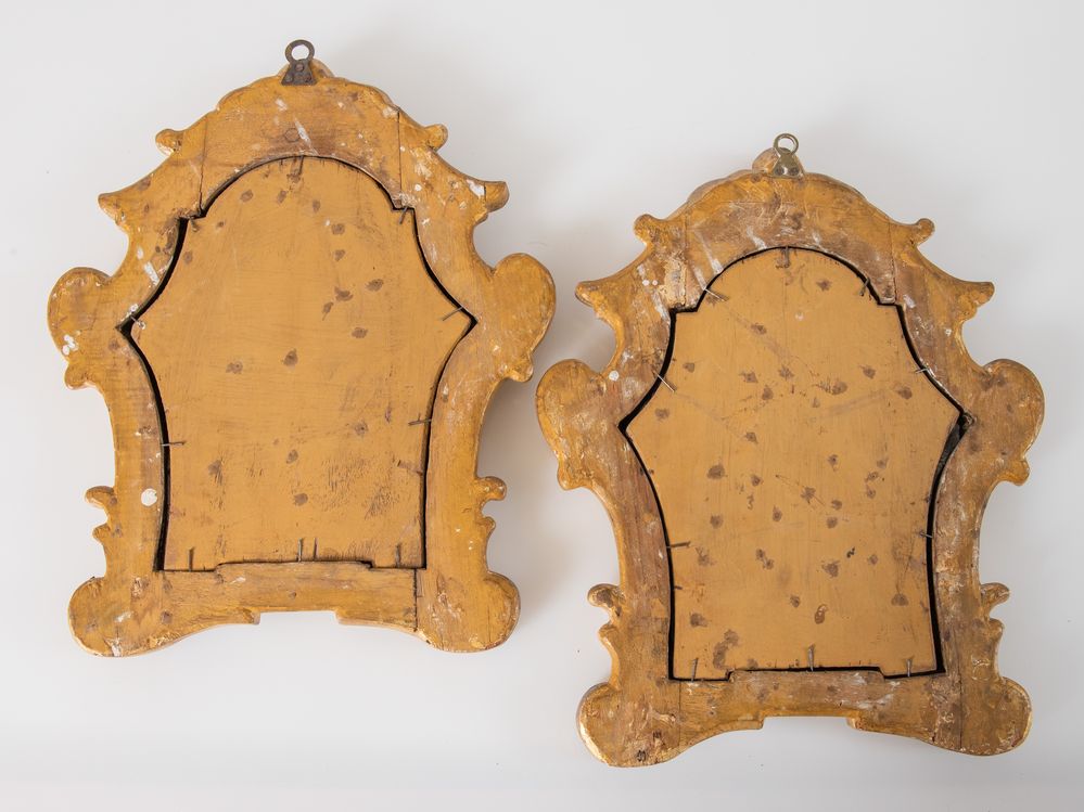 Coppia di cantaglorie di legno intagliato e dorato. Emilia, seconda metà del XVIII secolo. Cadauna di cm 34x28x3.