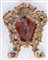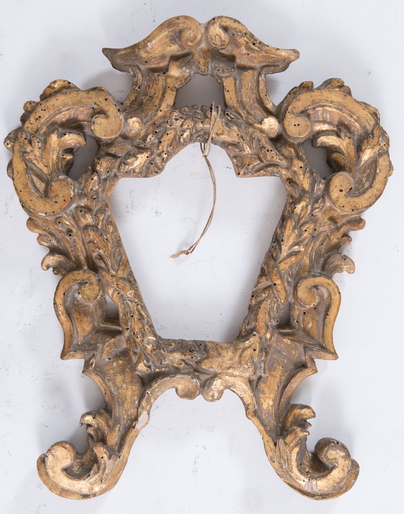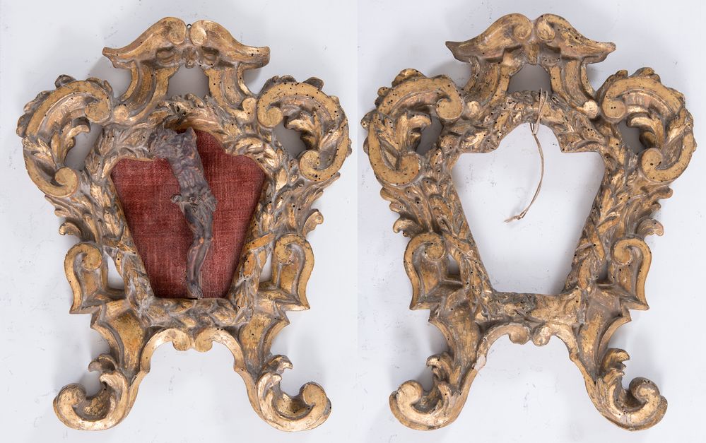 Coppia di cantaglorie in legno intagliato dorato. Una reca frammento di crocifisso. Emilia, metà del XVIII secolo. Cm 34x26,5. (lievi difetti)