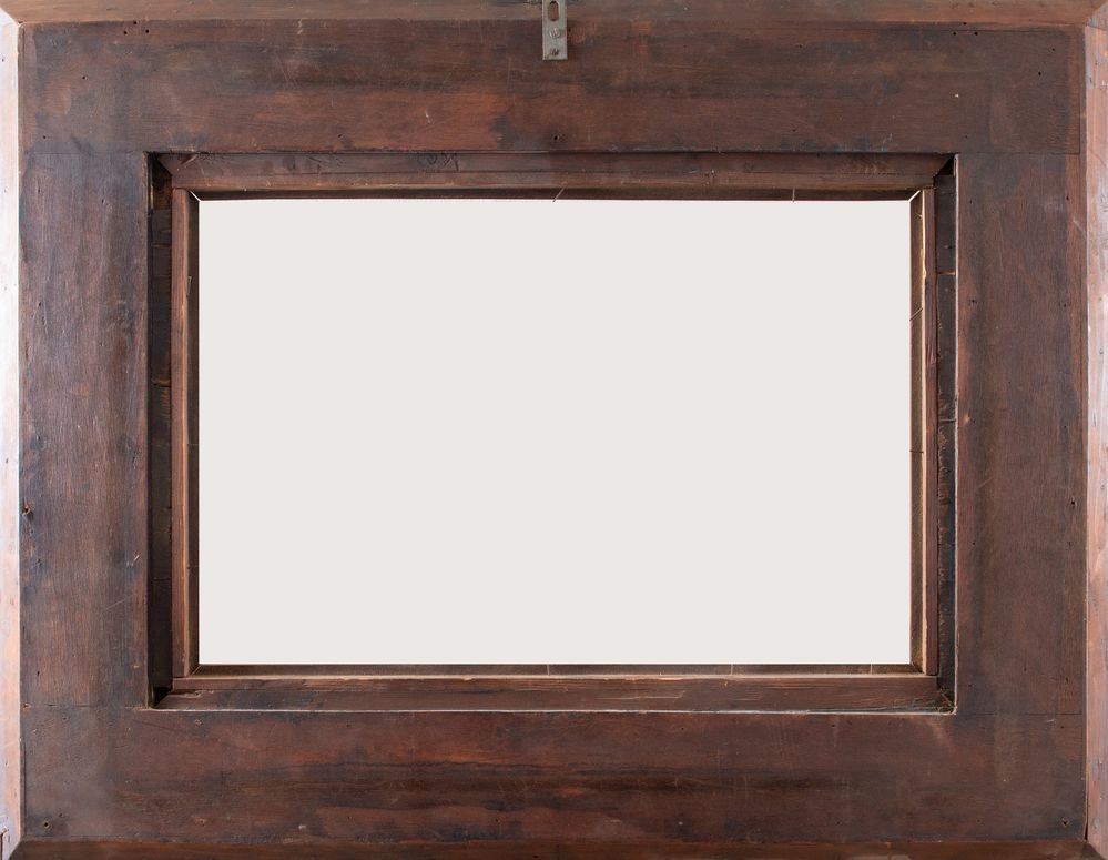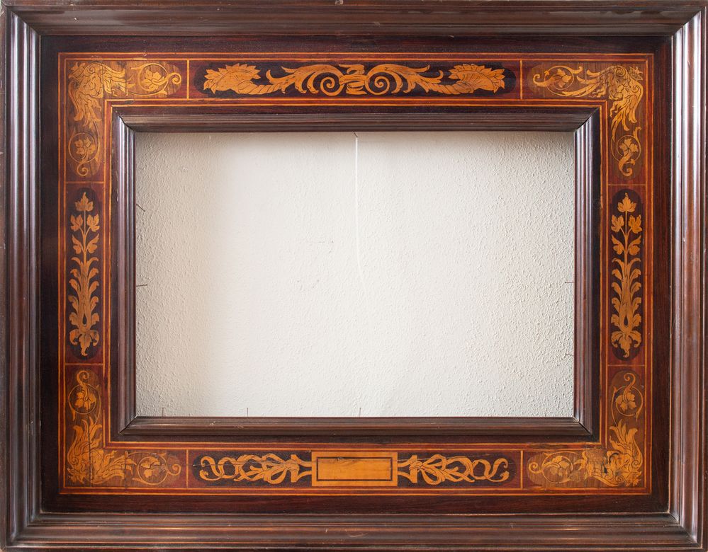 Cornice a cassetta di gusto seicentesco, con fascia intarsiata con mascherone e volute. Fine XIX - inizi XX secolo. Cm 79x101x7.