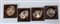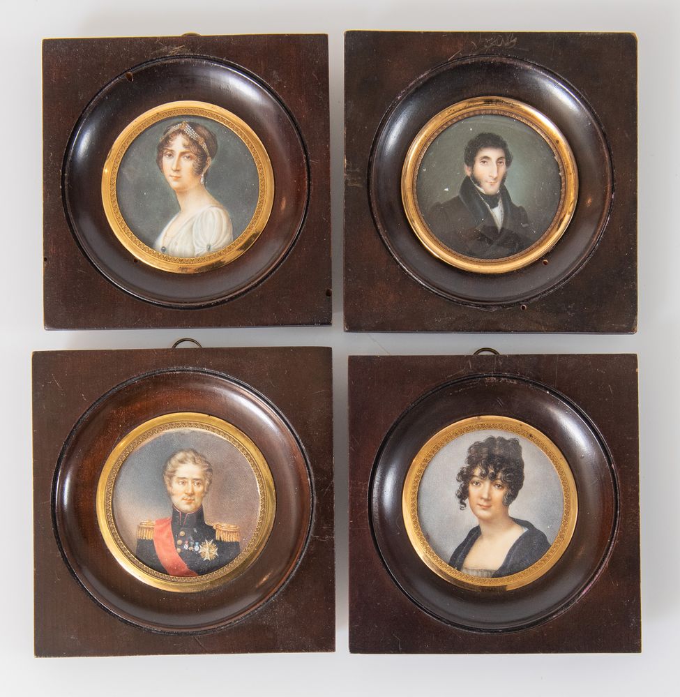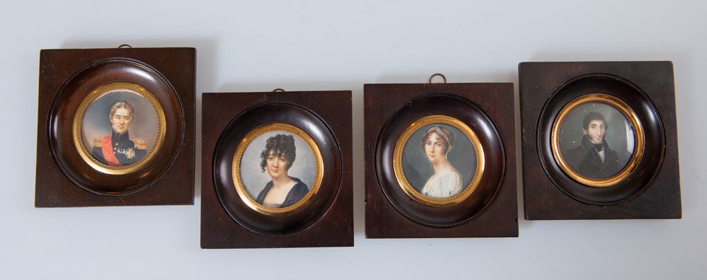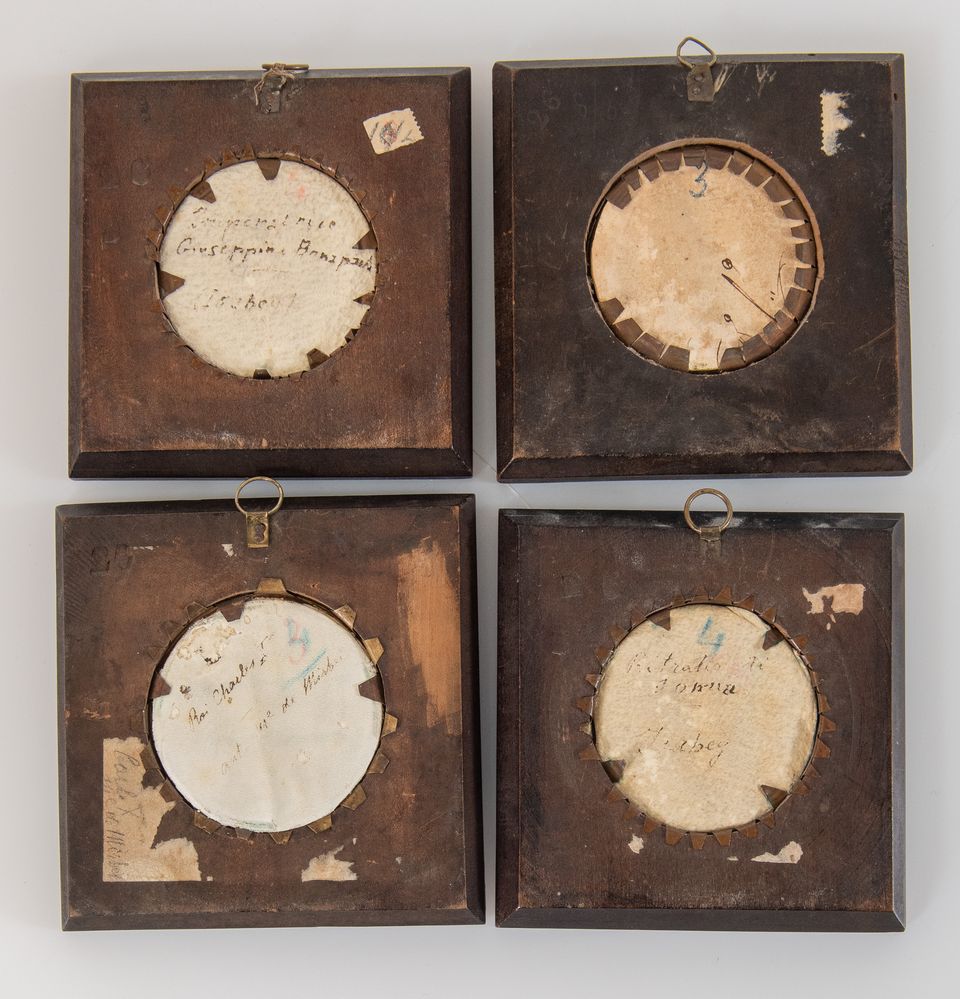 Quattro miniature su avorio entro cornici in legno ebanizzato. Una delle miniature reca sigla T.B. Prima metà del XIX secolo. Cadauna di cm 11,5x11,5.