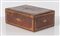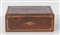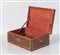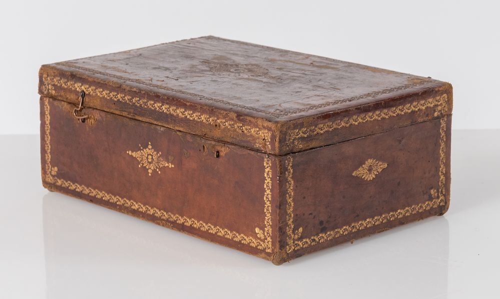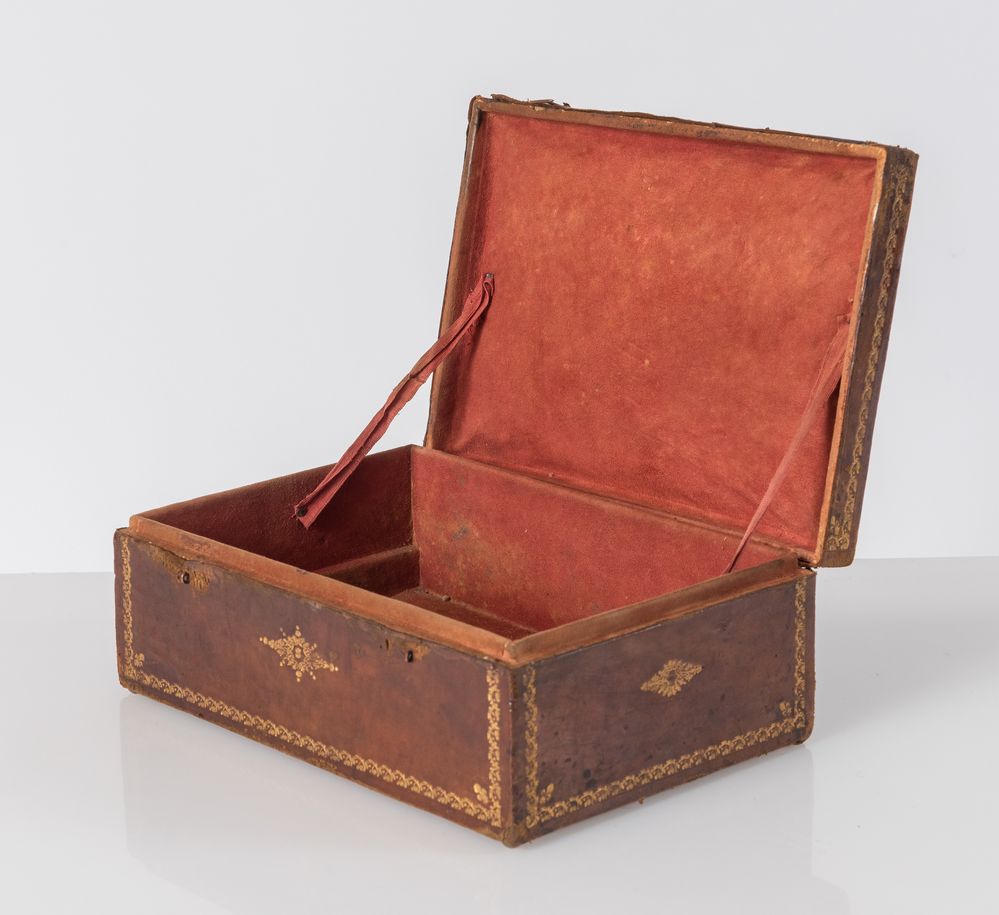 Scatola in legno rivestita in cuoio marocchino con decori dorati. XIX secolo. Cm 10,5x27x18,7.
