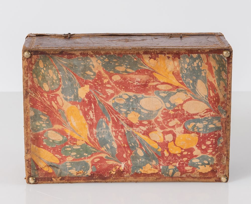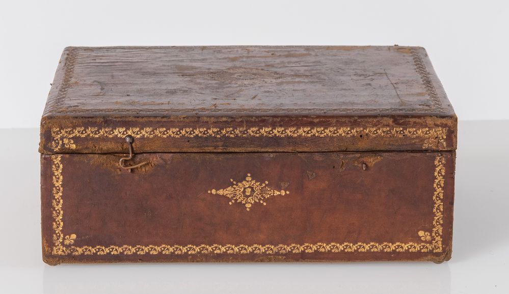 Scatola in legno rivestita in cuoio marocchino con decori dorati. XIX secolo....