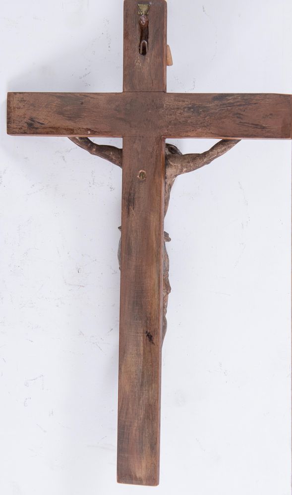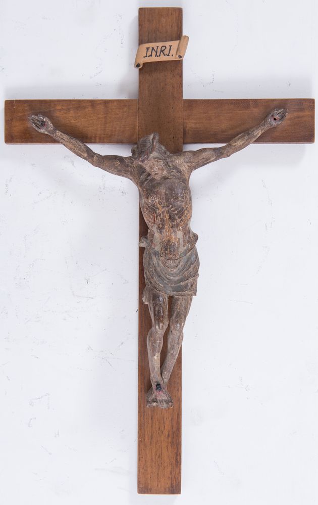 Crocifisso in legno intagliato e laccato. Figura del cristo antica con frammento della laccatura originale. Fine XVII - inizio XVIII secolo. Cm 44,5x28,5.