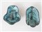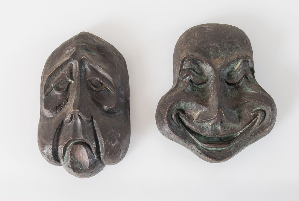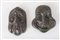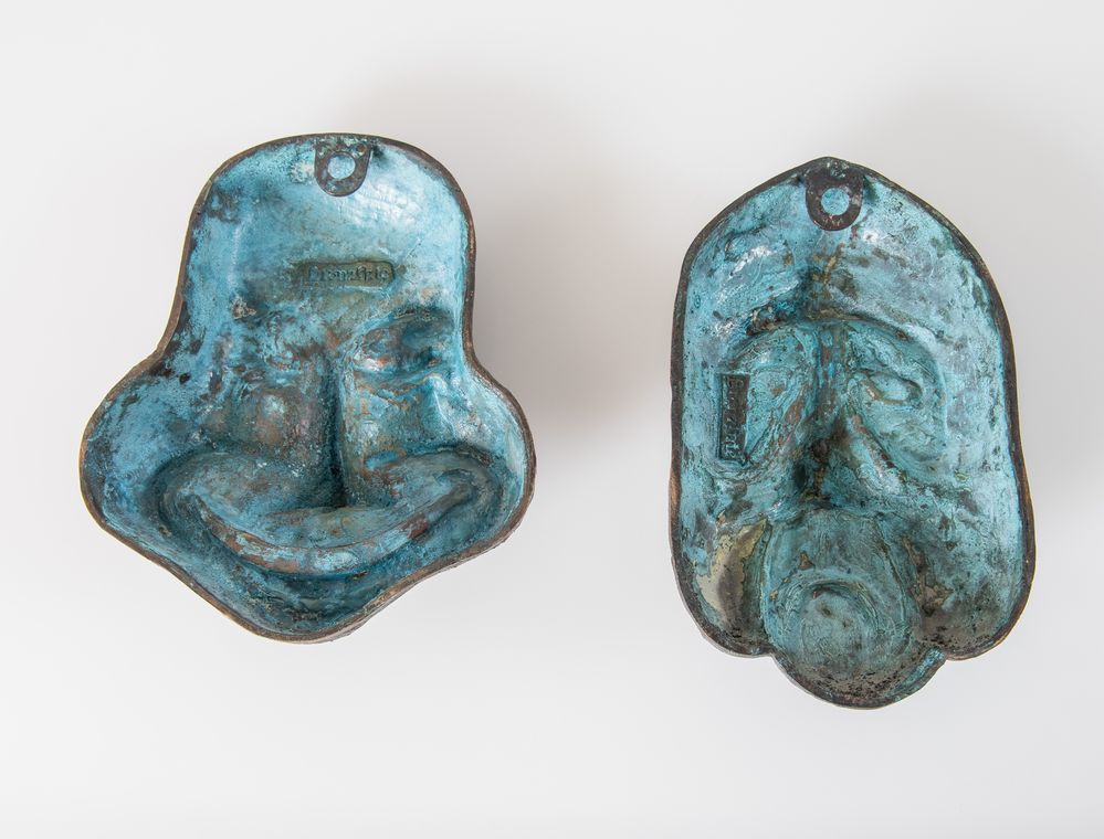 Coppia di mascheroni in bronzo. Rispettivamente di cm 19x12 e 18,5x15,5.