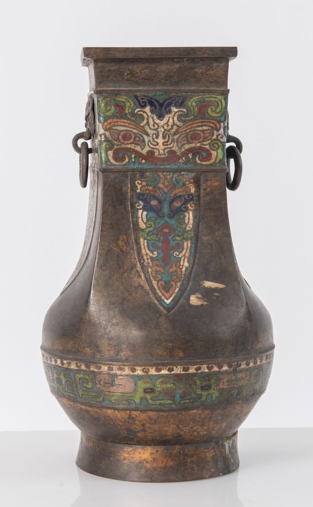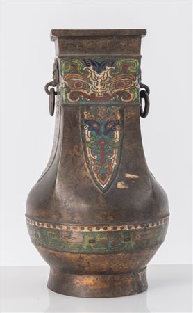 Antico vaso in bronzo con applicazioni di smalto in cloisonne. Cina. Cm 33xØ18,5.