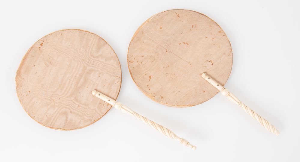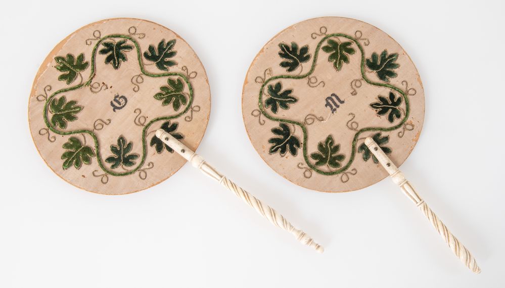 Coppia di ventagli con manici in materiale prezioso e ventole ricamate in...