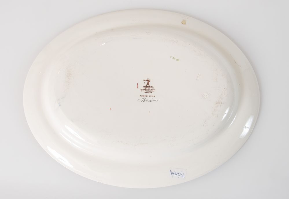 GIO PONTI per RICHARD GINORI Vassoio, dalla serie Marina, San Cristoforo, Milano. XX secolo. Cm 42x33. Sotto la base reca timbro e firma Marina, San Cristoforo, Milano.