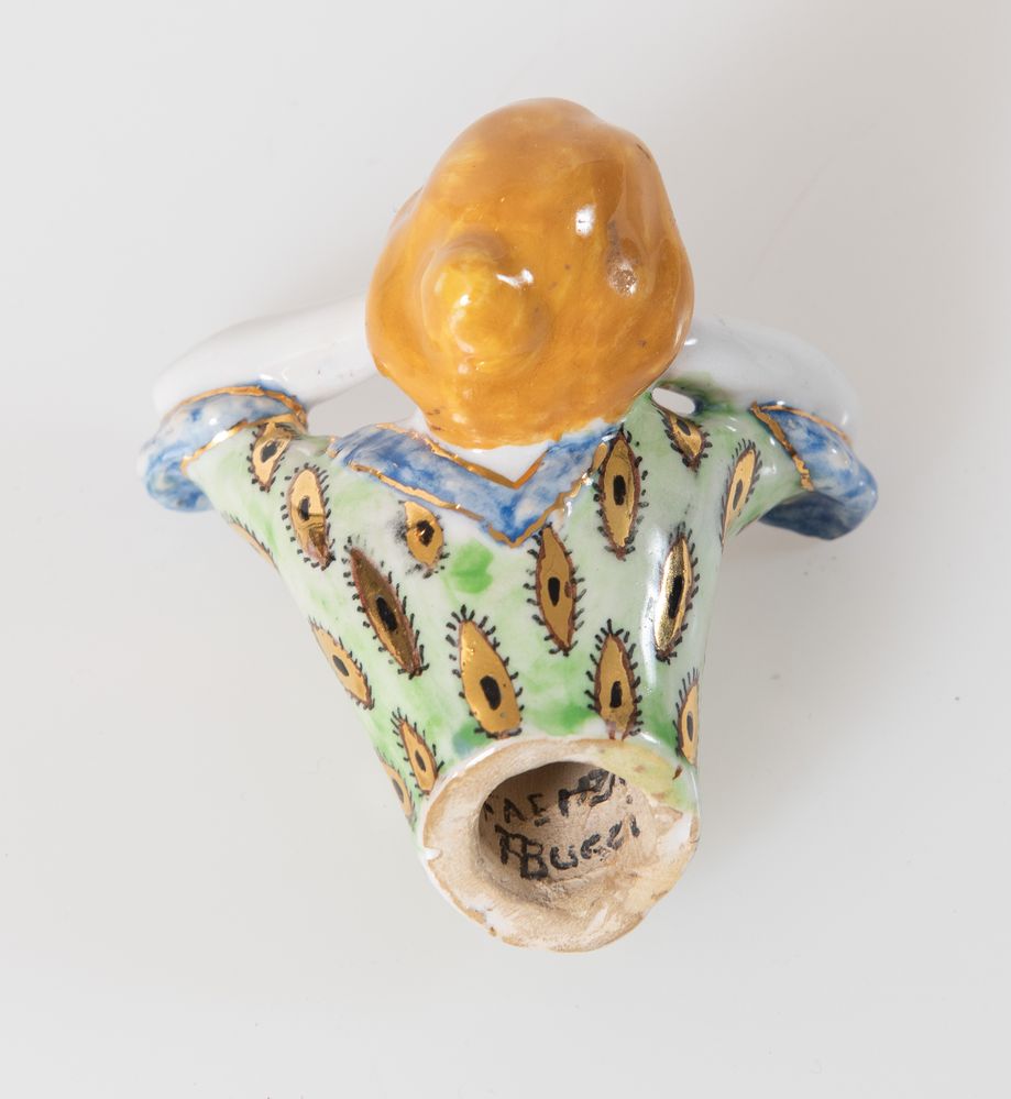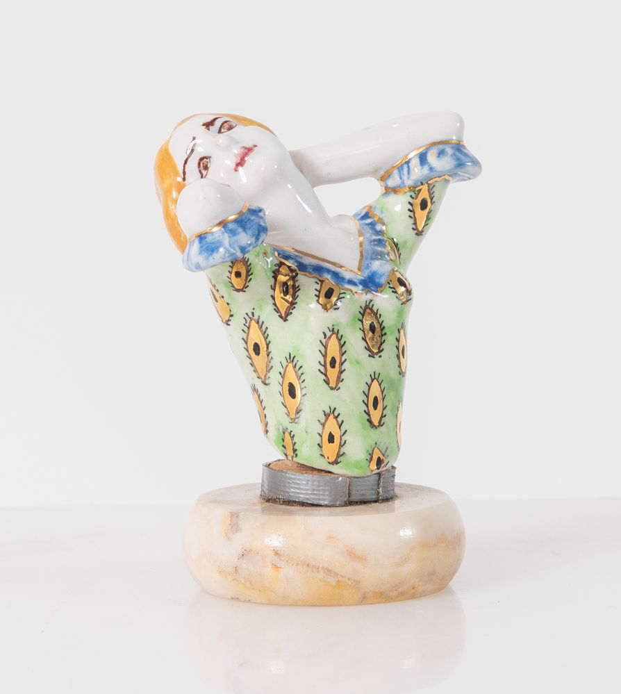 ANSELMO BUCCI (Faenza 1887 - 1957) su modello di Francesco Nonni (Faenza 1885 - 1976). Sculturina fermacarte in ceramica a terzo fuoco su base di marmo. Cm 10x7x7. All'interno reca scritta Faenza Bucci.