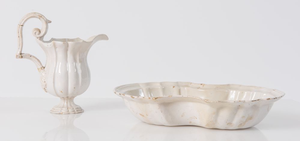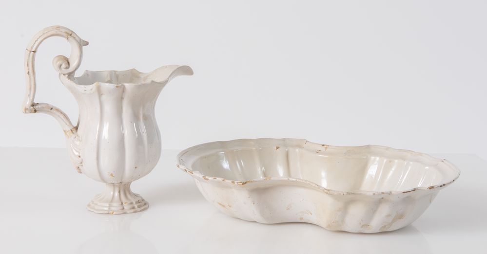 Lotto composto da brocca e catino in maiolica bianca. XVIII secolo. Brocca di cm 25x23x12,5 e catino di cm 7x39x27,5. (difetti e rotture)