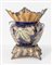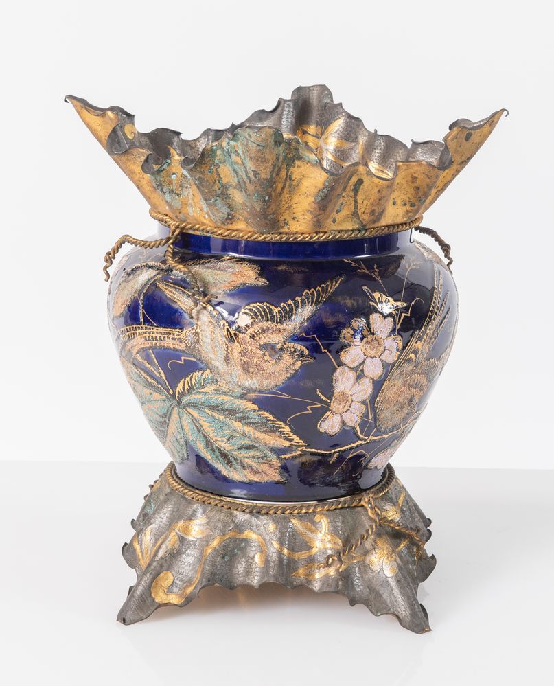 Vaso in porcellana blu con decori a fiori e foglie a rilievo in sabbia e applicazioni sul collo in bronzo dorato. Francia, fine XIX - inizi XX secolo. Cm 38x34,5x34,5.