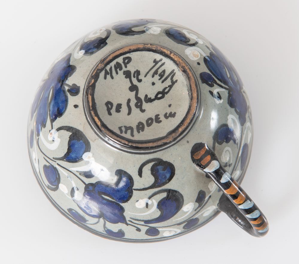 MAP, Pesaro. Servizio da tè in maiolica dipinta, composto da 11 elementi: otto tazze, una teiera, una lattiera e una zuccheriera. Rispettivamente di cm 4,5x12x9,5; cm 18x26x16; cm 12x18x12 e cm 11,5x17,5x11.