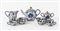 MAP, Pesaro. Servizio da tè in maiolica dipinta, composto da 11 elementi: otto tazze, una teiera, una lattiera e una zuccheriera. Rispettivamente di cm 4,5x12x9,5; cm 18x26x16; cm 12x18x12 e cm 11,5x17,5x11.