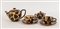 Servizio da tè composto da teiera, zuccheriera e coppia di tazzine con piattino. La teiera reca sotto la base sigla RBC (difetti e rotture). Ø piattini: 15,4 cm.