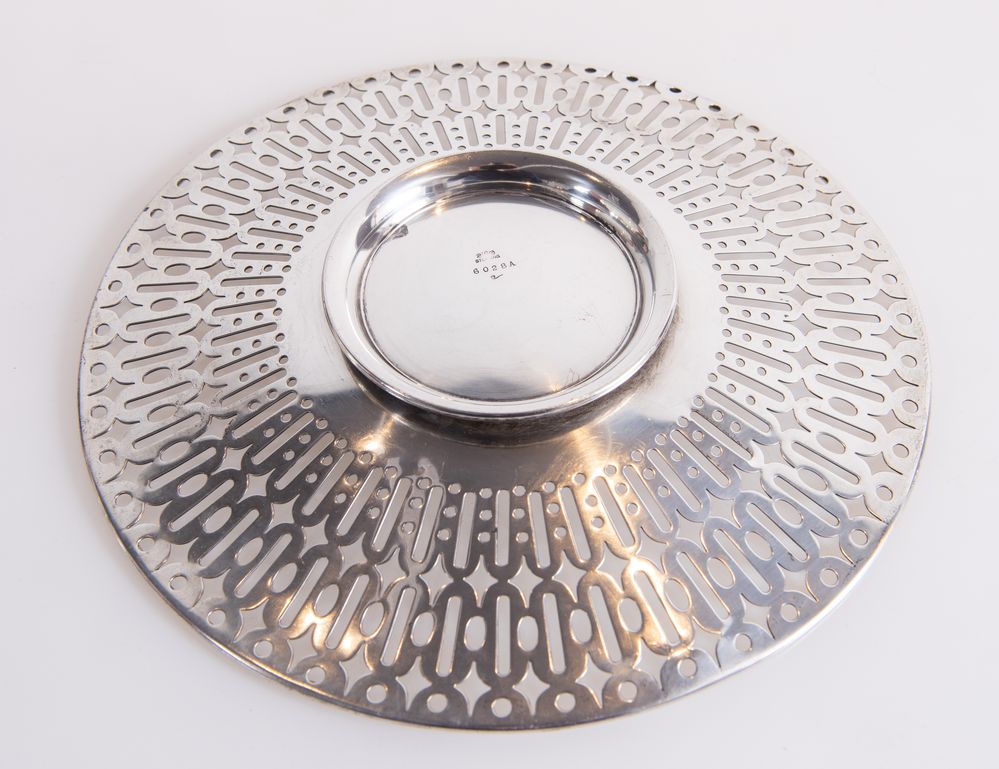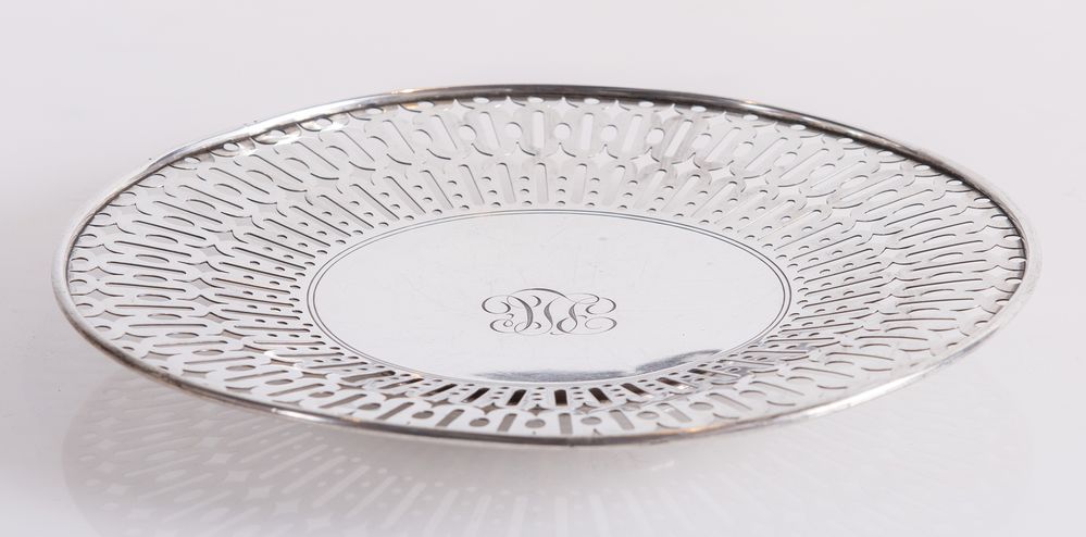 Piatto lavorato in argento 925. Sotto la base reca punzoni stemma dell'argentiere, sterling, 6o28A, pipa. Gorham, USA, 1911. Cm Ø 23,8x2,5 Peso: 280 gr.