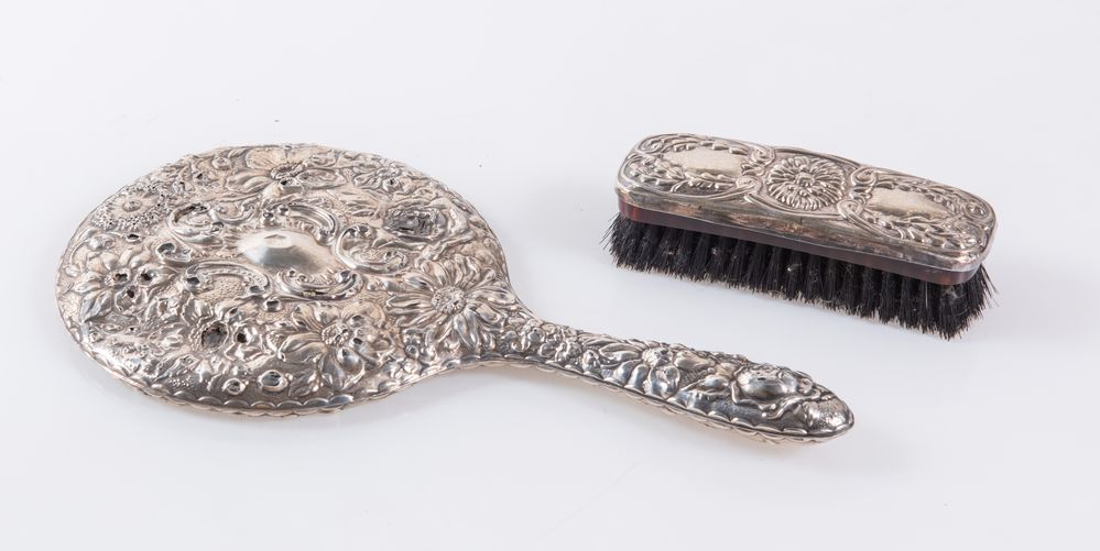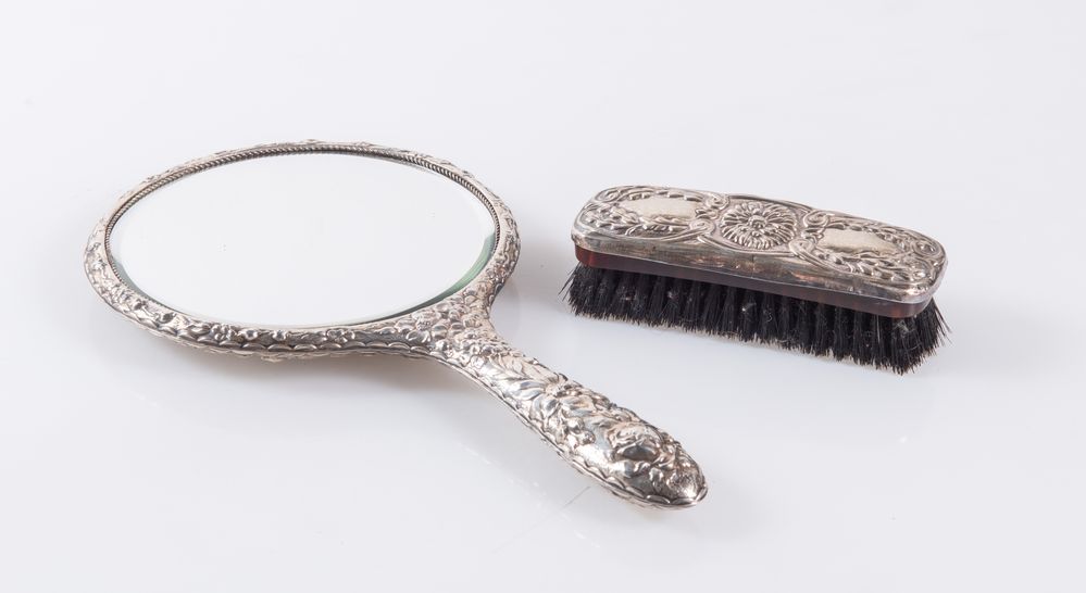 Set toilette in argento 925 composto da specchio (Birmingham, 1902) e spazzola (argentieria italiana, seconda metà del XX secolo). Recano punzoni: specchiera: stemma dell'argentiere. ancora, leone passant e lettera dataria c; spazzola: 925, losanga locativa fiorentina, GR. Specchio cm 29x16; spazzola cm 4x13,5.