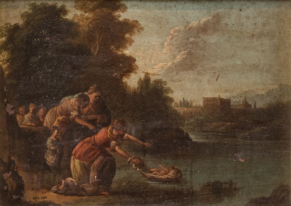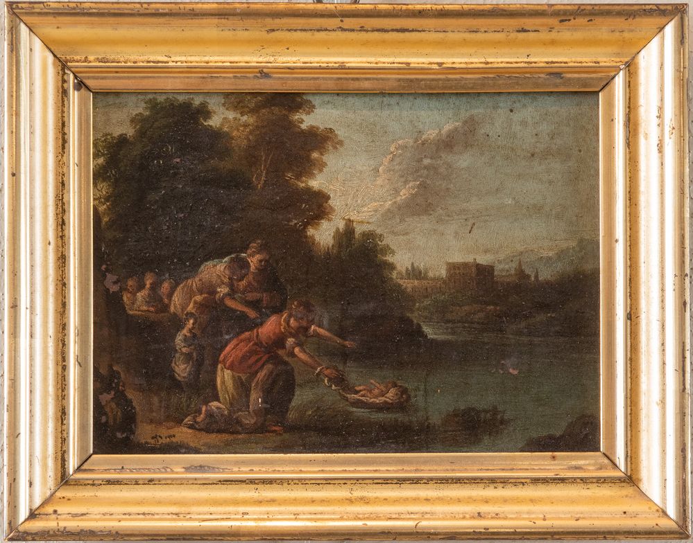 Maestro del XVIII secolo. “Mosè salvato dalle acque”. Olio su rame. Cm 16x22,3.